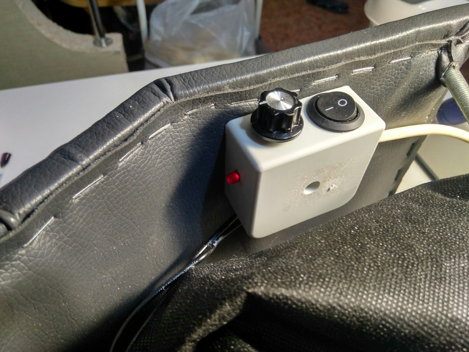 Добавляем кнопку включения, припаиваем провода подвода питания и от вентилятора, крепим к корпусу. Собираем все в кучу, одеваем также сшитый своими руками из флизелина мешок для сбора пыли. Все готово можно пользоваться.