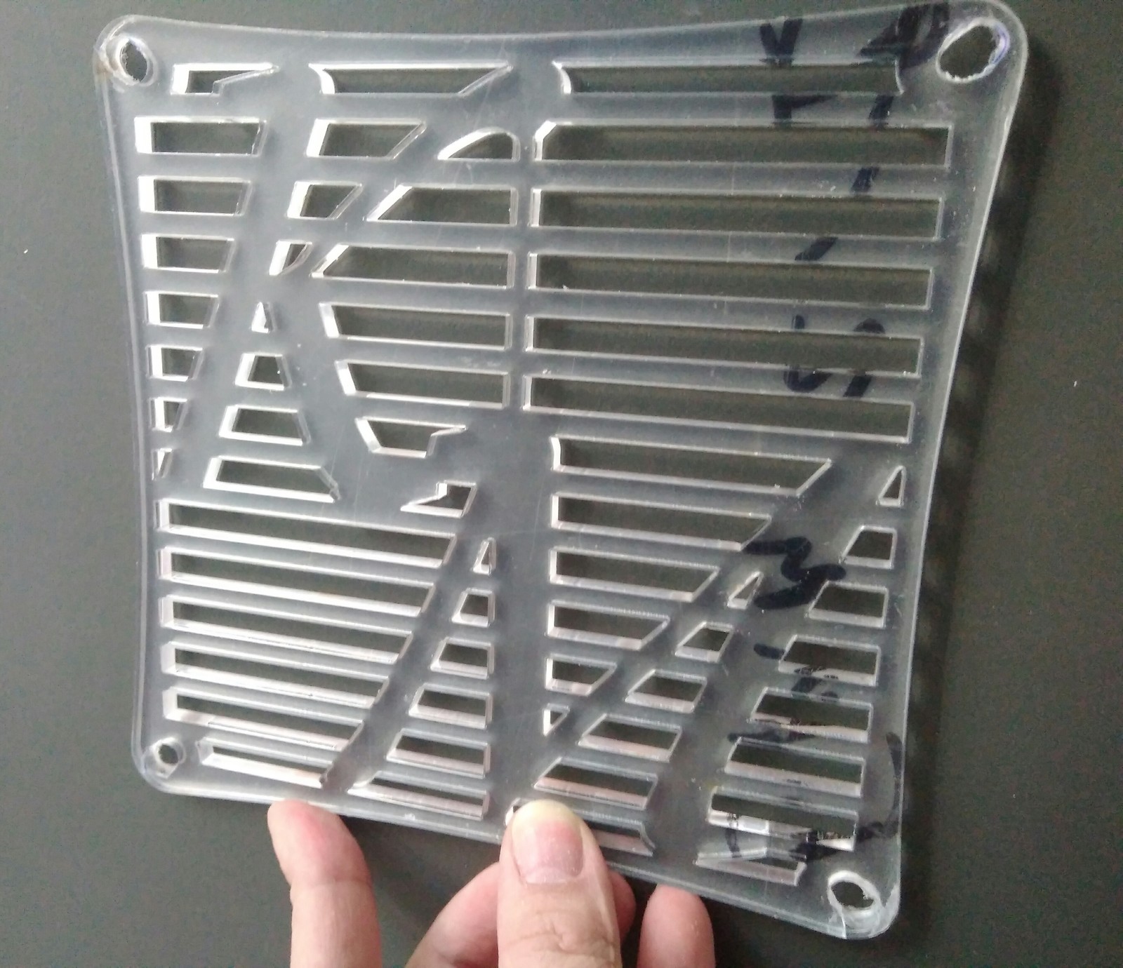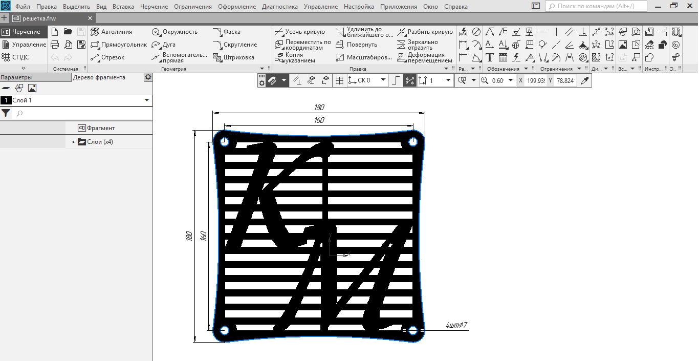 В прошлой версии слабым местом была пластиковая решетка перед вентилятором, она была не очень прочная, да и смотрелась не очень красиво. Будем делать новую из оргстекла. Лазера у меня дома нету, поэтому пришлось обратится в контору, которая занимается резкой оргстекла, но это после, для начала нарисуем решетку в программе КОМПАС 3D