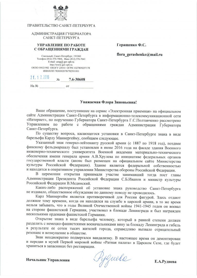 «Ваше обращение <…> по поручению Губернатора Санкт-Петербурга Г.С.Полтавченко рассмотрено Управлением по работе с обращениями граждан Администрации Губернатора Санкт-Петербурга», — сообщила Флоре Геращенко начальник этого управления Елена Руднева.