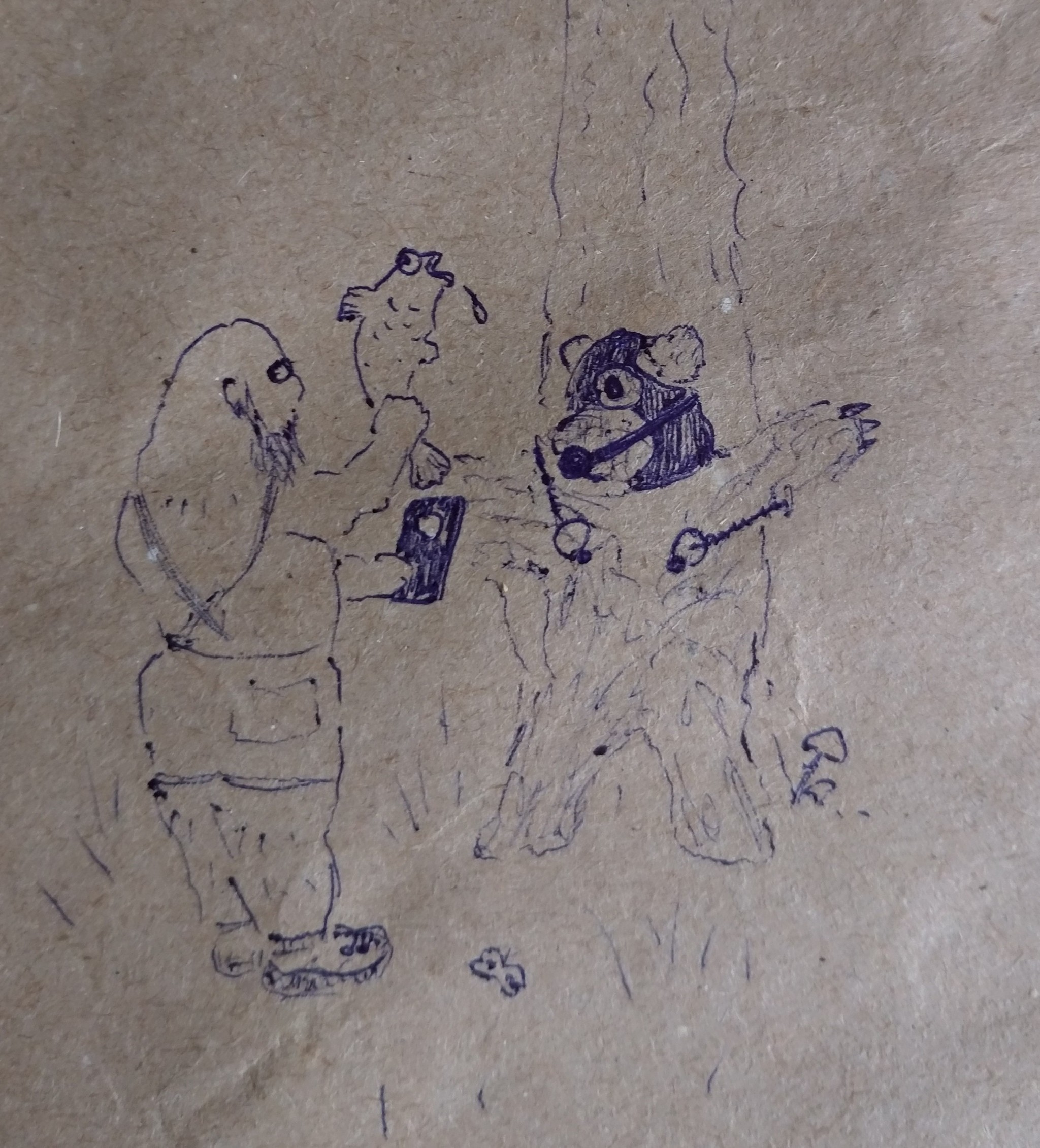 - Почему за Маней не следим? Опять из загона сбежала, я её в лесу нашёл, лососем отшлепал, и к дереву привязал. Идите, забирайте.