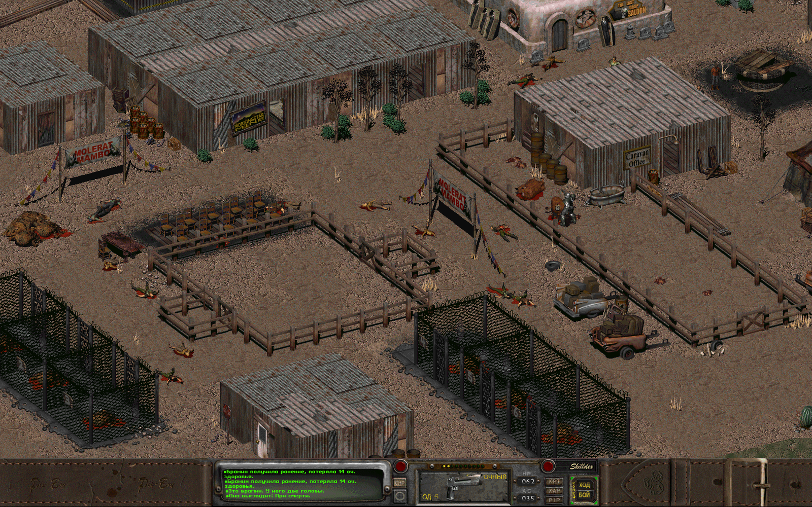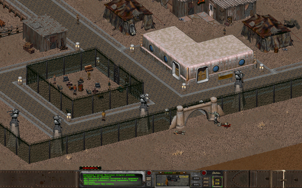 Поскольку лужица не имеет ничего против мародерства, то я безпрепятственно забираю всё что хочу с прилавков, включая силовую броню (с микрореактором на сто лет работы, отсоси, четвёртый фолл!), различное оружие, аптечки и боеприпасы. В таком виде уже и не стыдно убивать наркоманов и детишек, но для разборки в Сан-Франциско уровень всё ещё маловат, поэтому возвращаюсь в ближайший к родной деревне городок - Кламат.