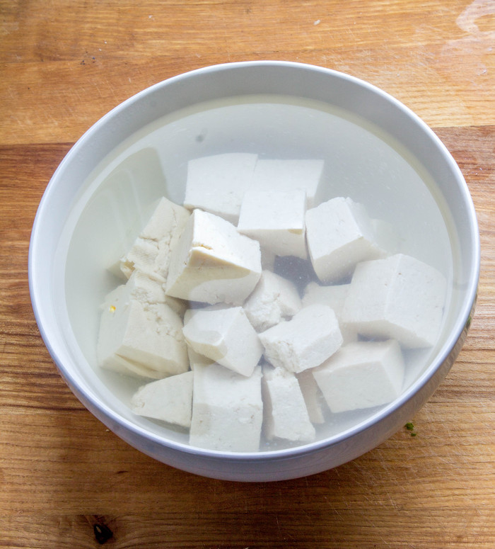 Тофу нарежем кубиками примерно по 2 сантиметра, бланшируем в кипятке примерно с полминуты и откинем на сито.