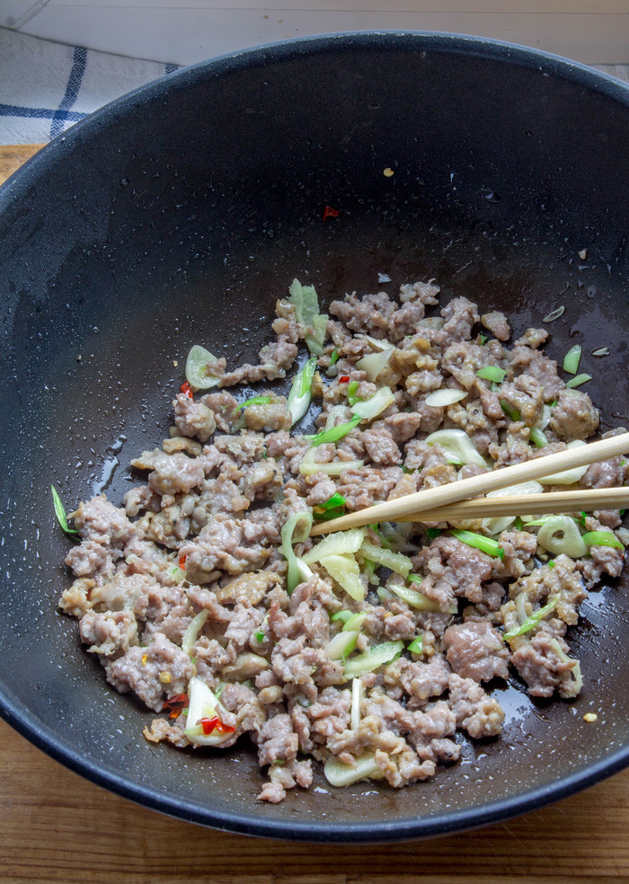 Разогреем в сковороде ложку растительного масла и обжарим фарш до изменения цвета, добавим к нему хлопья чили, чеснок, имбирь, лук, продолжая обжаривать до появления приятного запаха чеснока.