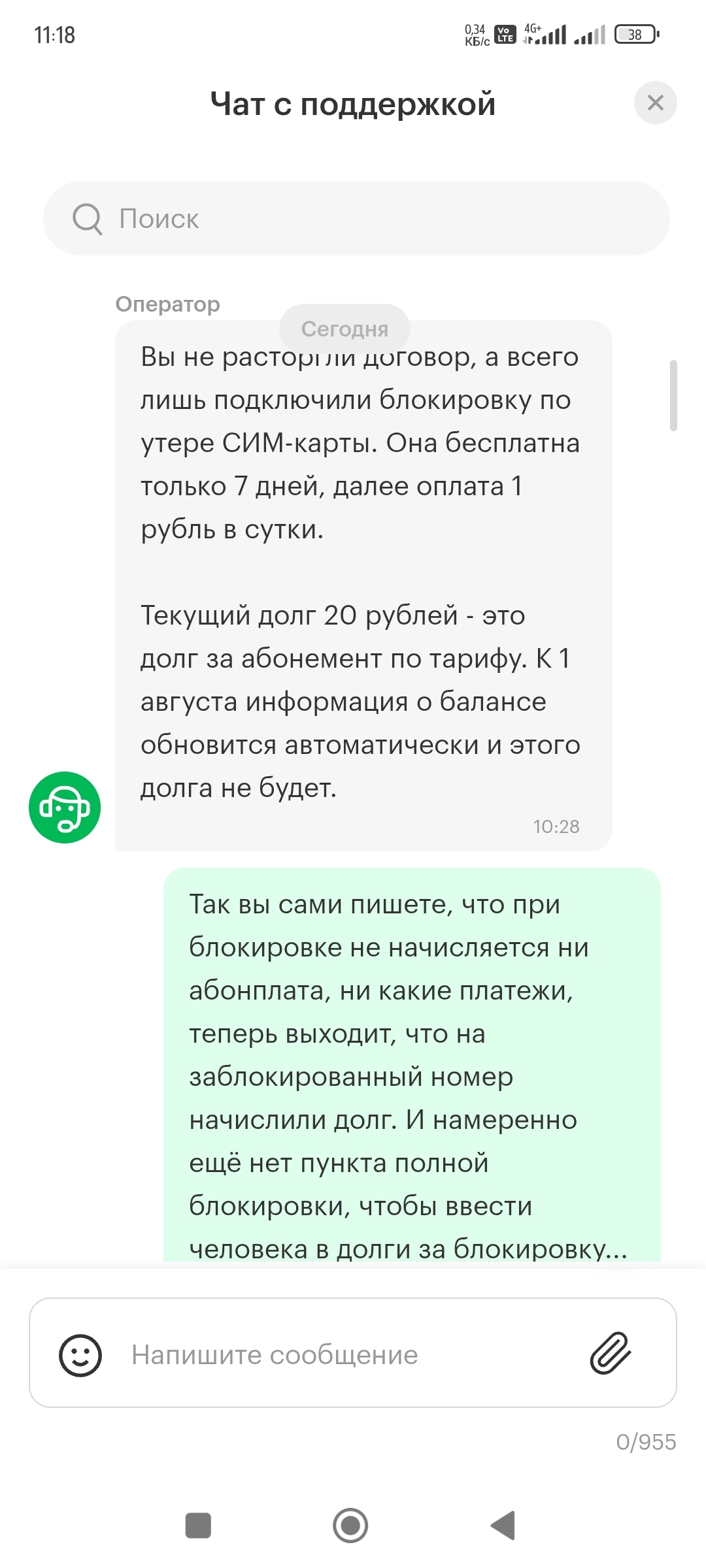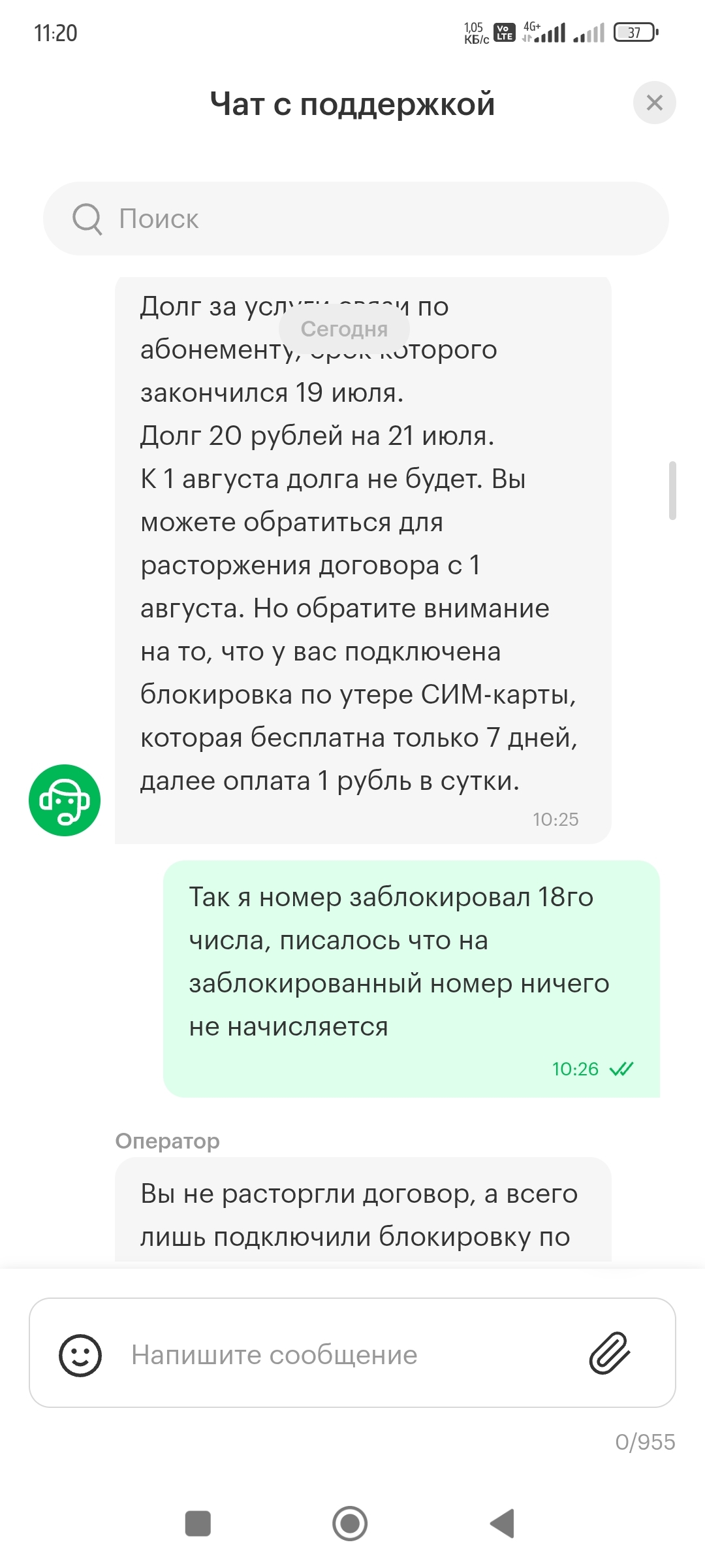 Долг этот она объясняет тем, что у меня был абонемент и вот на 21е число 20р за абонемент. То что номер заблокирован 18го и при блокировке указывается, что на заблокированный номер ничего не начисляется, никакие платежи, абонплаты и тд, она пропускает мимо ушей. Но долг спишется 1го августа, правда там уже будет другой долг, за услугу блокировки номера! А сейчас я должен перейти на тариф без абонплаты, оплатить долг и внимание!!! - заполнить заявление и прислать его в чат...