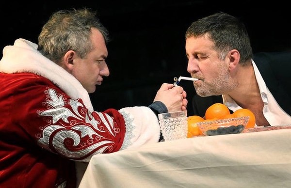 Теперь немного об истории спектакля. Пьеса была написана Родионом Овчинниковым для творческого дуэта Гармаша и Ярмольника. Вот так, никакого Скляра. И в таком виде она есть в открытом доступе в сети. Между прочим, Ярмольник в театре не играл с 1983 года. И ради этой пьесы вернулся в театр.