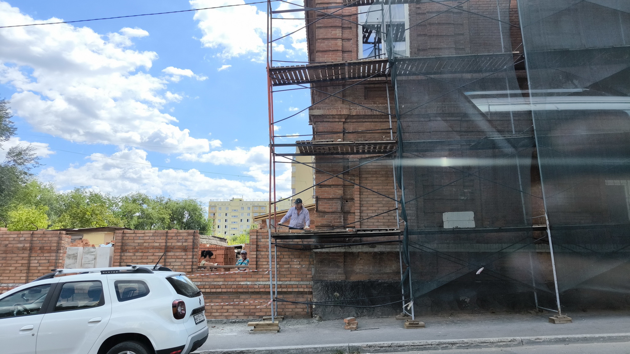 Куда же без нее? Чтобы не расслаблялись, как говорится. Но такие железобетонные скелеты уже не торчат повсеместно и не мозолят глаз, как раз наоборот - выглядят в диковинку на фоне восстановленных зданий.