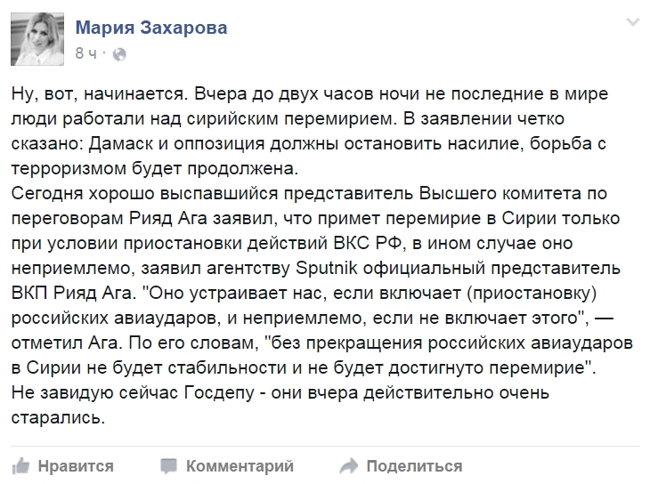 86 psyh0strike 9 лет назад Мария Захарова о Сирии https://www.facebook.com/maria.zakharova.167/posts/102089446... Сирия Политика Оппозиция ИГИЛ Россия США Е с Перемирие