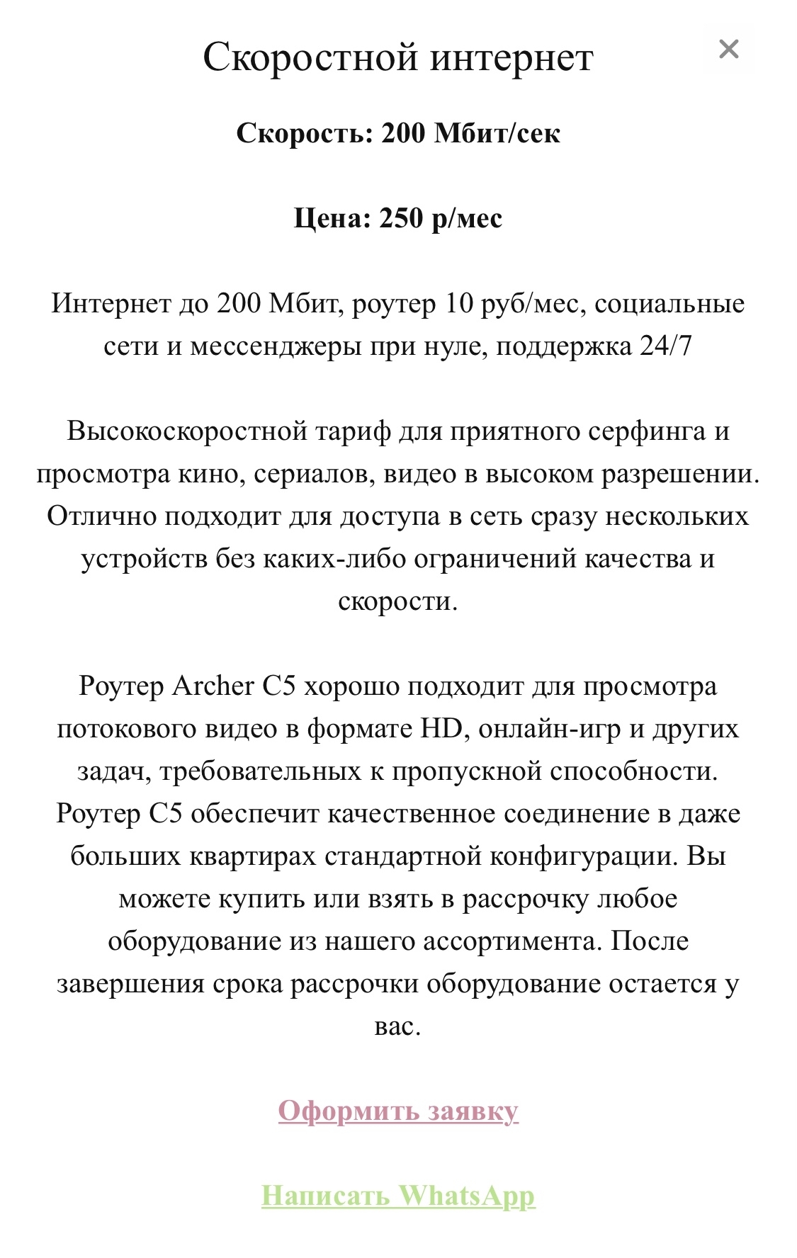 Оставил через форму сайта заявку и почти сразу же поступил звонок. Оператор бодро сообщила совсем другие цены, если честно не сильно дороже 350 домашний интернет и 150 аренда роутера, но отсутствие обещанного на сайте и не соответствие действительности отбили желание, что либо подключать.