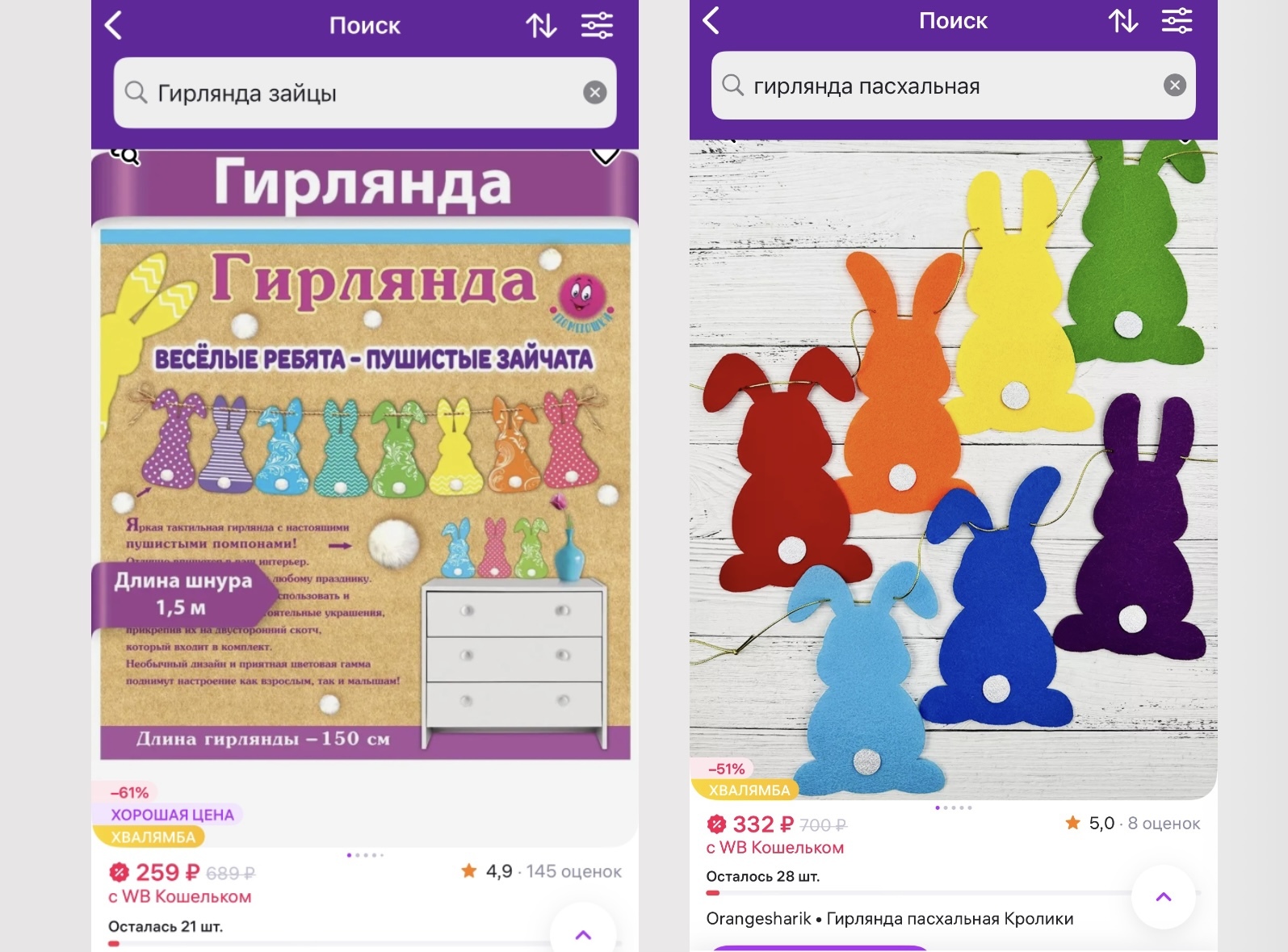 Если искать гирлянду с зайцами, но назвать её пасхальной - придётся заплатить чуть больше, Пасха же на носу. Так что лишний раз про Пасху в поисковой строке лучше не заикаться, а то и сравнение цен не поможет :)