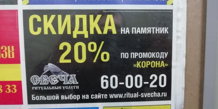 5 Graphiel Маркетинг в Смоленске 5 лет назад В рекламном буклете местное ритуальное агентство «Свеча» предлает скидку на свои услуги по промокоду «Корона». Коронавирус Ритуальные услуги Боги маркетинга Смоленск Промокод Ещё 0
