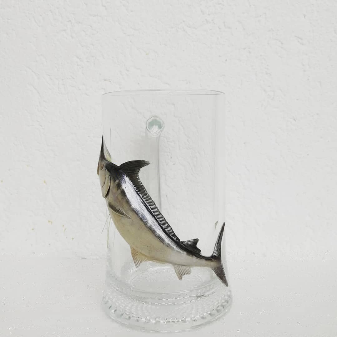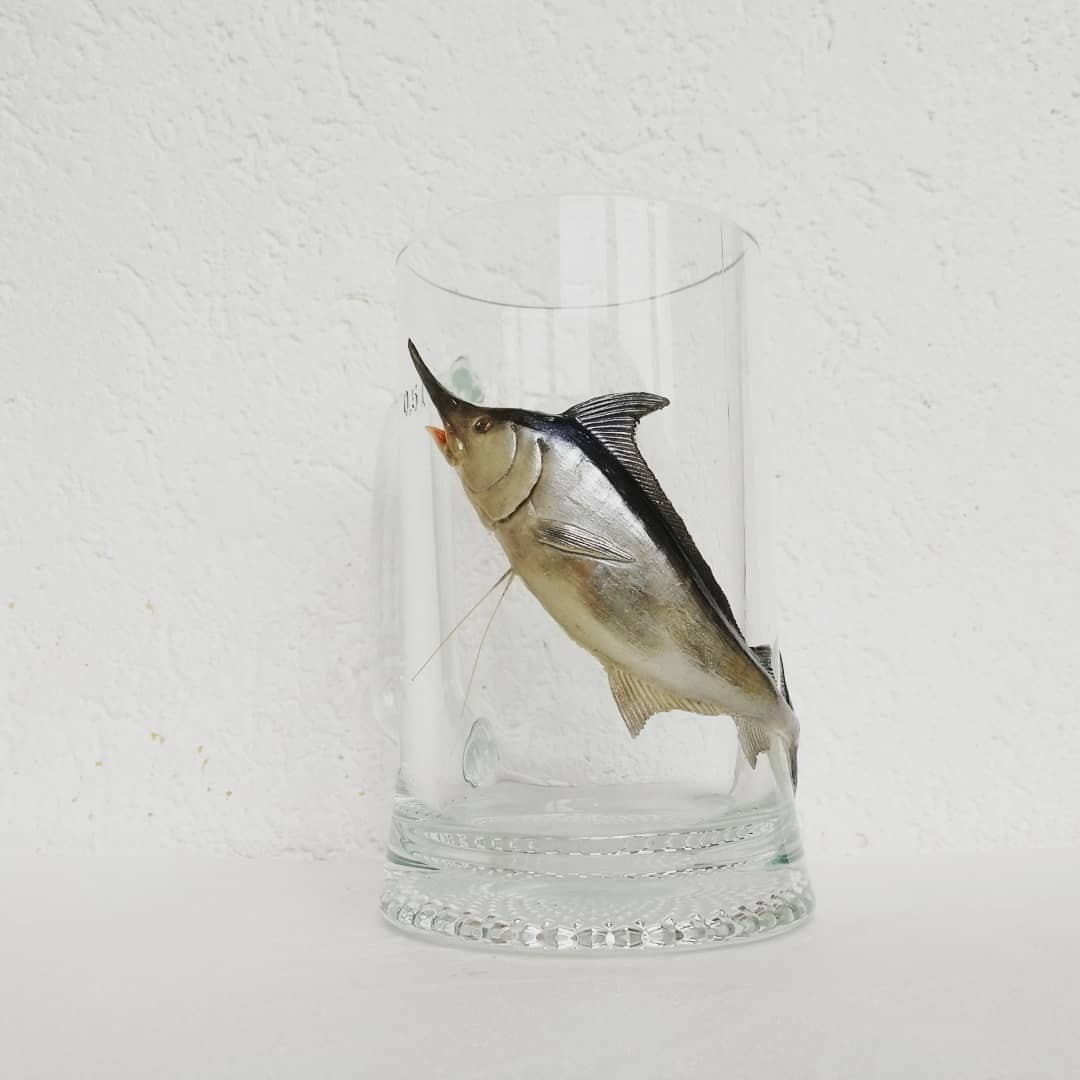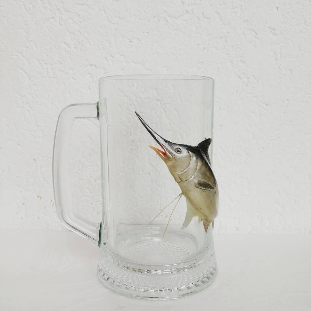 Несколько раз порывалась слепить марлина, но как представлю этот длинный "завернутый за угол кружки нос" ... Желание исчезало. И тут заказ - марлин на пивной. Сначала думала отказать, ибо не вижу носатую рыбину на деформированной поверхности. Пришла в голову мысль поместить её вертикально. Пересмотрела множество фото, на них он как раз выпрыгивает из воды. Решено ваять!