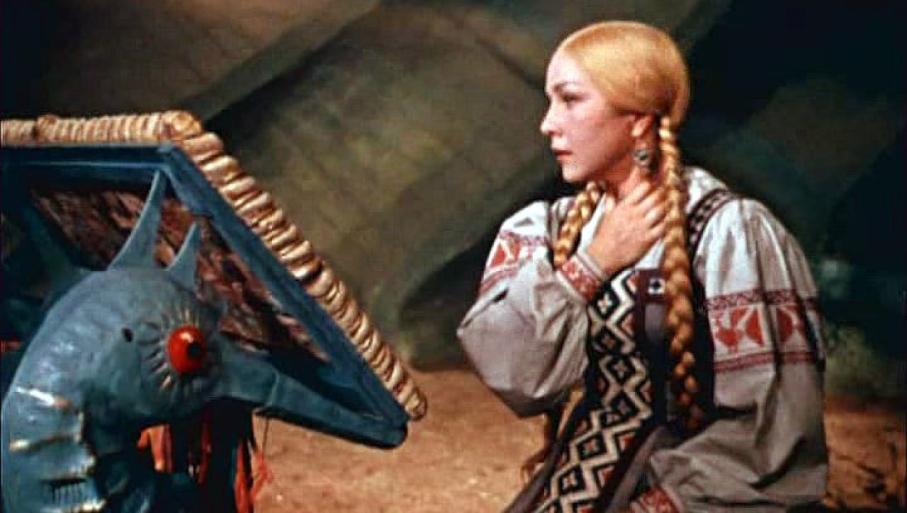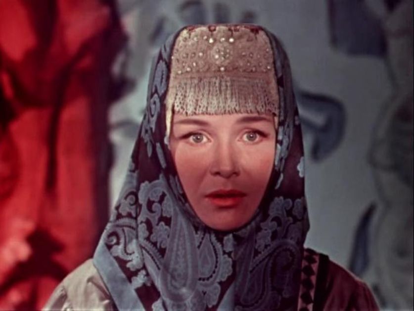 Про девичьи головные уборы я уже упомянула в «Морозко», поэтому поговорим о женских уборах. Тем более что в этом фильме мы можем увидеть один из самых красивых и фантастических кокошников — Каргопольский однорогий кокошник. Кстати, он не бутафорский или имитация традиционного головного убора, а самый настоящий. Не знаю, где его нашла команда Роу, но факт, нашли.
