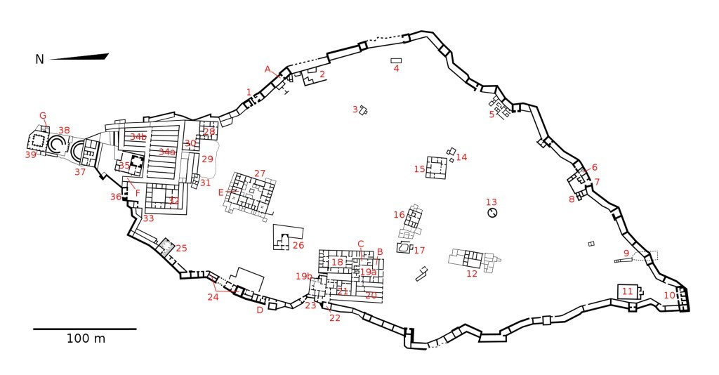 A. Место обнаружения отрывков из Книги Бен-Сиры. B. Тронная комната Ирода. C. Красочные мозаики. D. Место пролома. E. Место обнаружения клада монет. F. Место обнаружения остраконов («место жребия»). G. Место обнаружения трёх скелетов.
