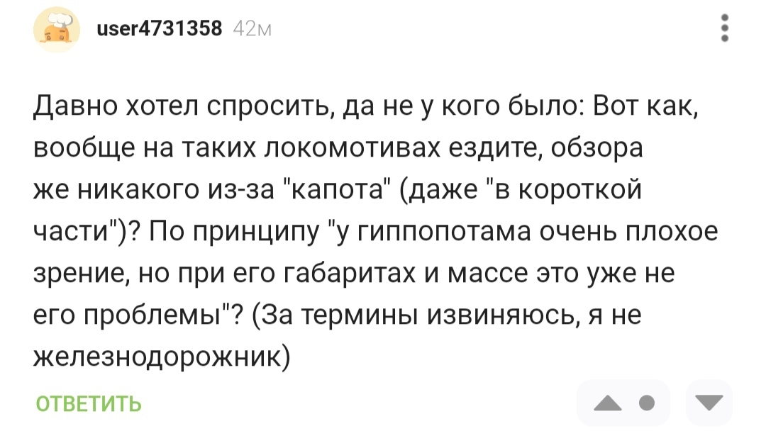 При управлении тепловозом обзорность ужасная, особенно в кривых участках, особенно малого радиуса. Органы управления для машиниста находятся справа по ходу движения (см.картинку), а что слева? Для этого есть специально обученный человек - помощник машиниста, который следит за обстановкой по ходу слева (видеофрагмент из поста). Мамкины оптимизаторы Эффектные управленцы придумали сократить бригаду до одного машиниста, заменив его зеркалами или камерой, установленной на торце лок-ва.