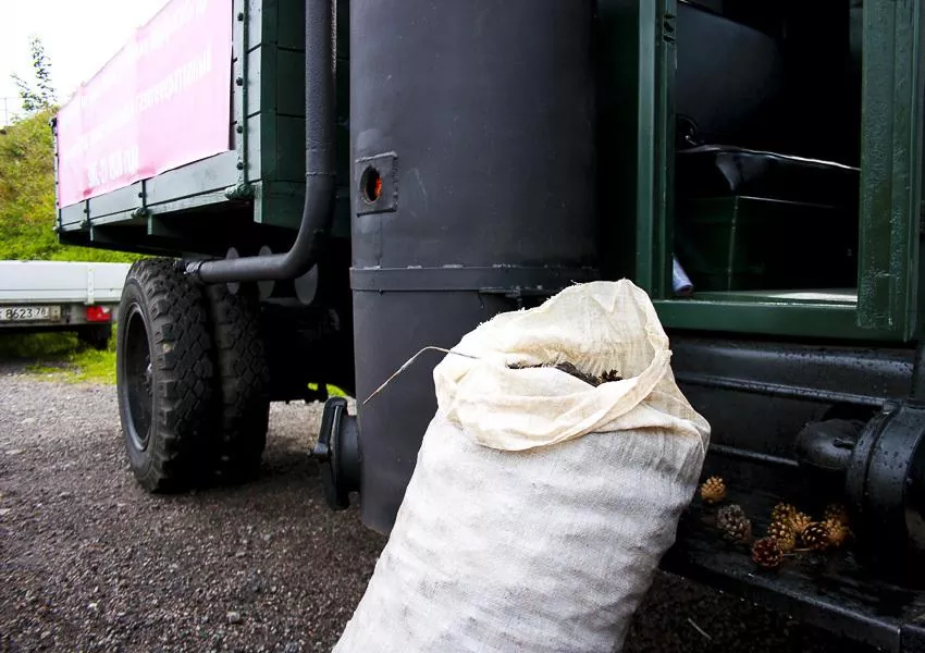 Что такое газогенераторный двигатель? Если говорить просто и не вдаваться в технические детали, то это большая печь для сжигания твердого топлива – дров, опилок в брикетах, торфа, шишек и даже угля. Только в отличии от печи обычной, дрова с шишками сжигались при минимальном доступе воздуха. В результате этого получался так называемый «генераторный газ» – смесь водорода, угарного газа и метана. Он потом охлаждался, очищался, насыщался воздухом и подавался непосредственно в цилиндры двигателя внутреннего сгорания. Никакого бензина, заправок и топливных баков. Знай себе подкидывай дровишки и езжай потихоньку.