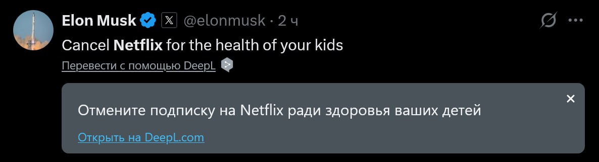 Маск увидел мультик и отписался от Netflix, выкатив лозунг "Отмените подписку на Нетфликс, за для здоровья ваших детей". Люди поддержали идею и начали массово отписываться от сервиса.