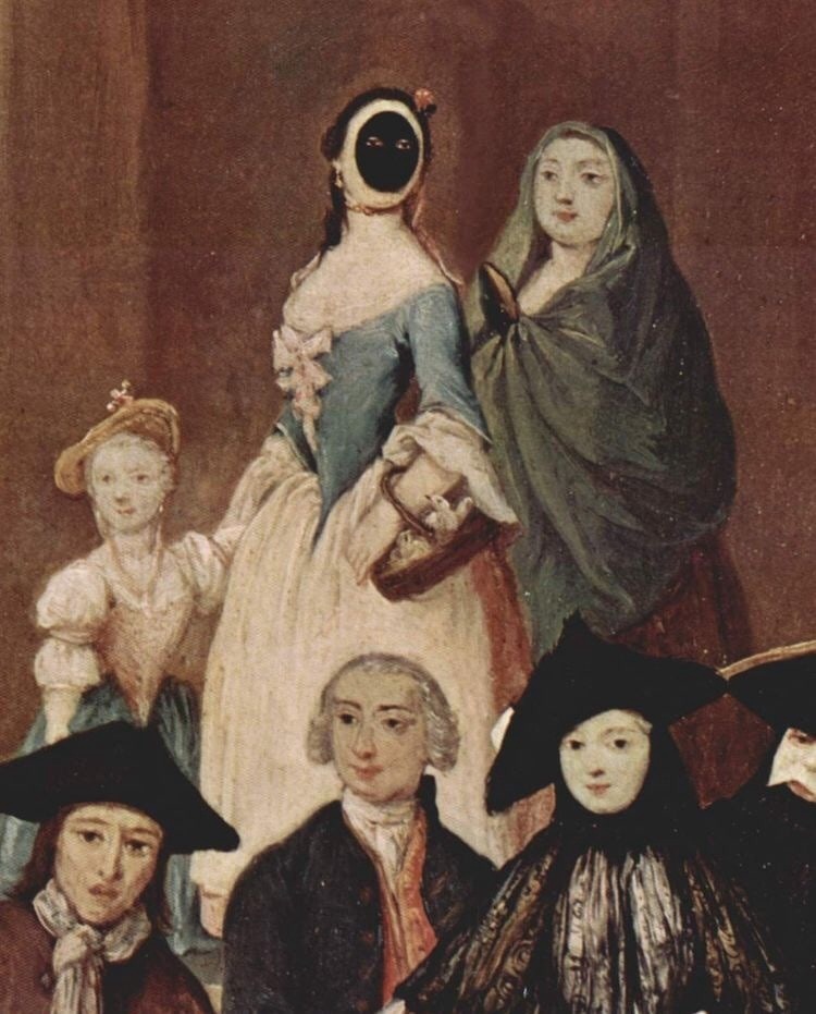 Возможно, самая странная и загадочная маска из всех - это маска Моретты. Она пережила короткий всплеск популярности, прежде чем исчезнуть к 1760 году. На ней не было ремней или лент, чтобы прикрепить её к лицу. Вместо этого маска Моретты удерживалась на лице с помощью кнопки, пришитой к внутренней части, которую владелица зажимала зубами. Это не позволяло даме говорить. Традиционно маску носили только женщины. Моретта поощряла идеал женской красоты эпохи Возрождения, подчеркивая тонкие изгибы лица и обязывая владелицу общаться с помощью языка тела, а не речи. По иронии судьбы, эта немая маска красноречиво говорит о том, как эпоха понимала место женщины в обществе.