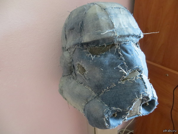 когда он джинсовый был готов ) я психанул . залил его лаком) прихерачил шланг) потом разорвал ему лоб и отдал другу) да пепакура.) у меня еще гдето валяется маска смерти дарксайдерса таким же способом почти дошитая только дермантином)недоделанные вархамерские- не буду больше из картона делать хрен склеишь.
