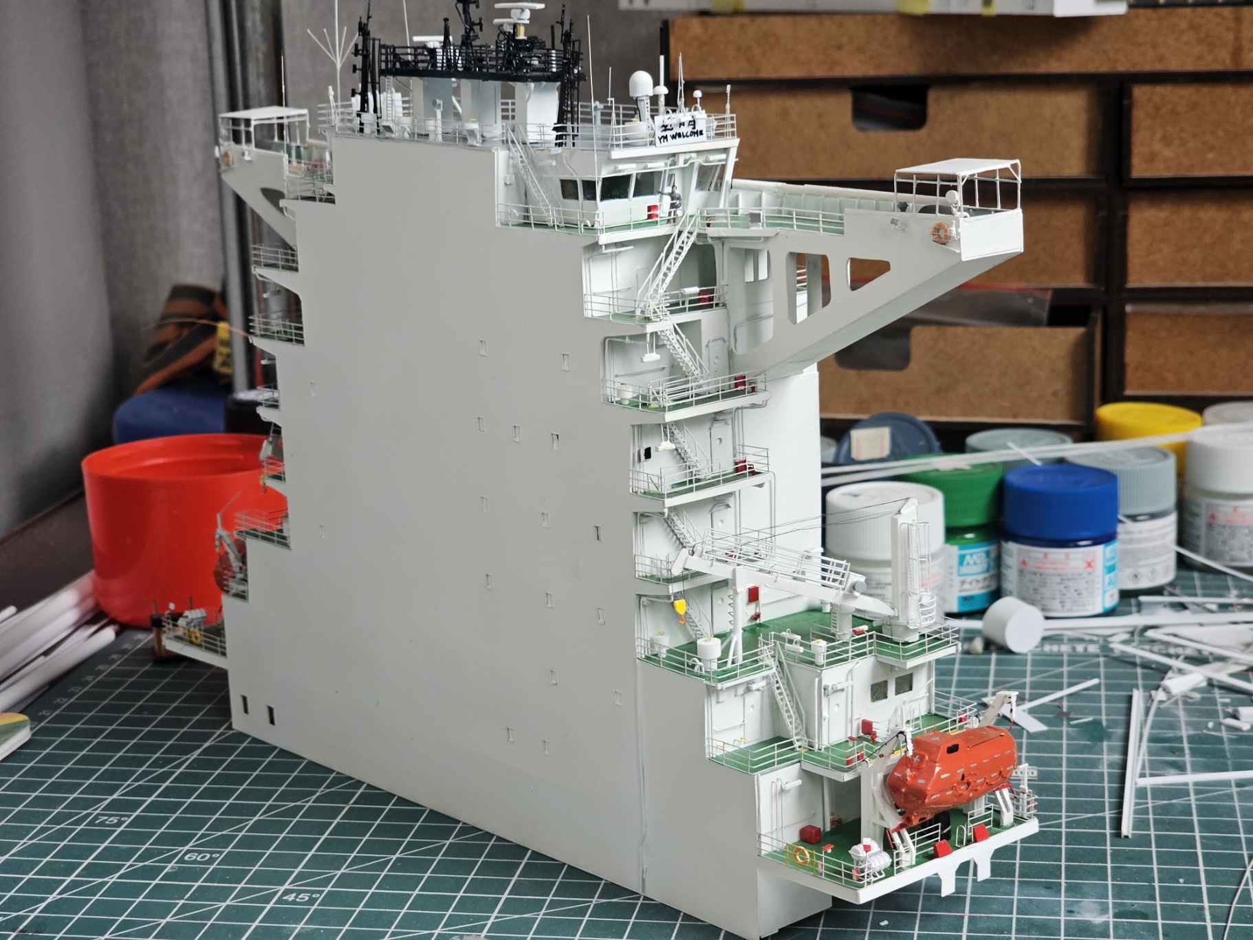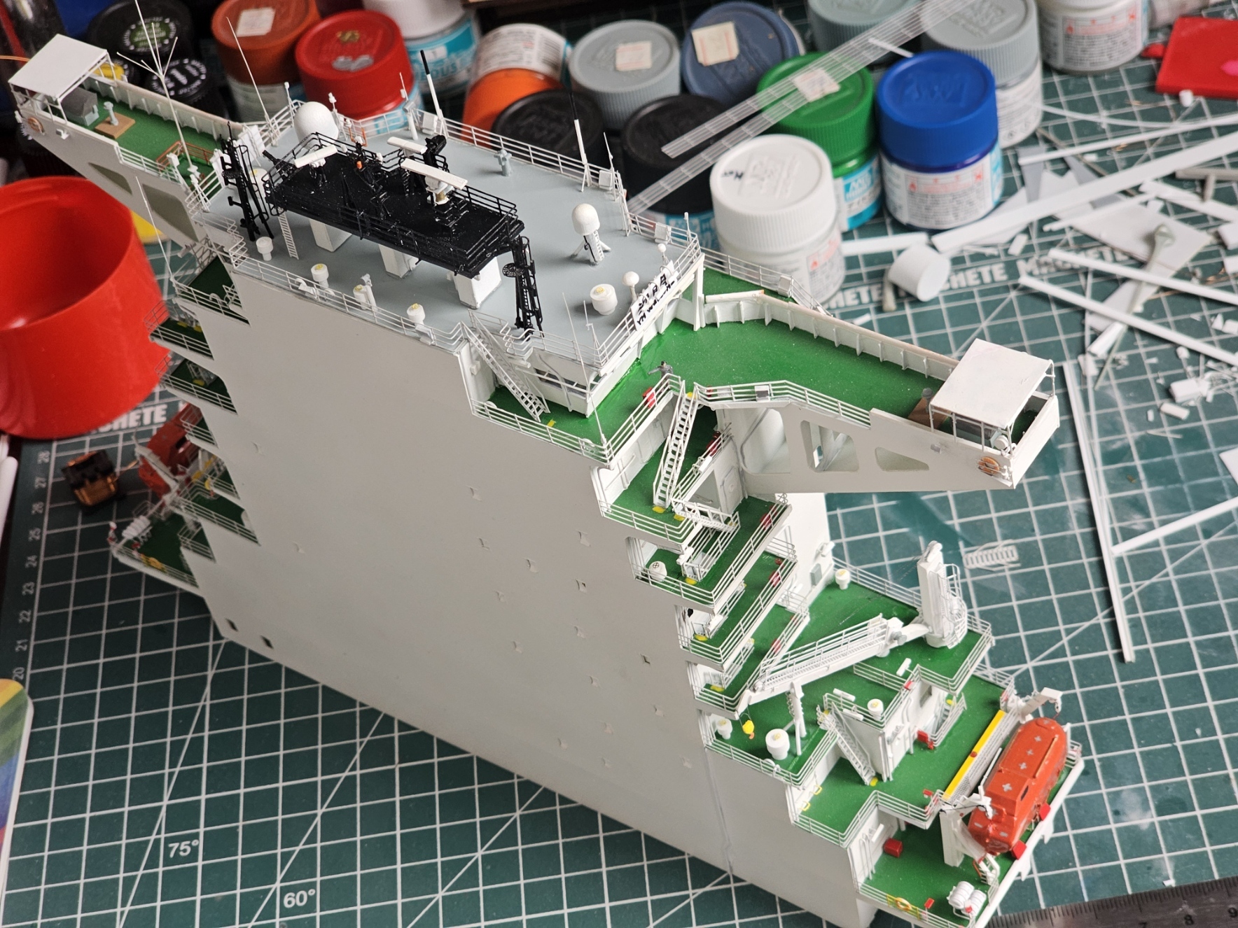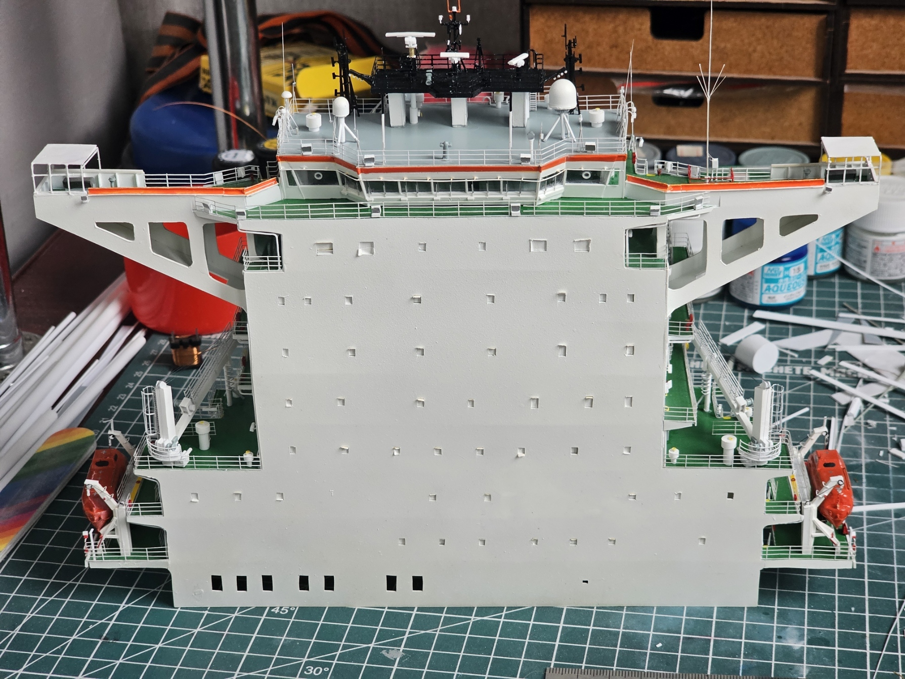 Ленту с остекления иллюминаторов пока не снимал так как предстоит еще набить но смокинг. Сам мост и манки айланд (Не знаю как оно зовется по русски) переделывал, так как интерьер мостика хреново виден из за неправильного выбранного мной материала стекол.