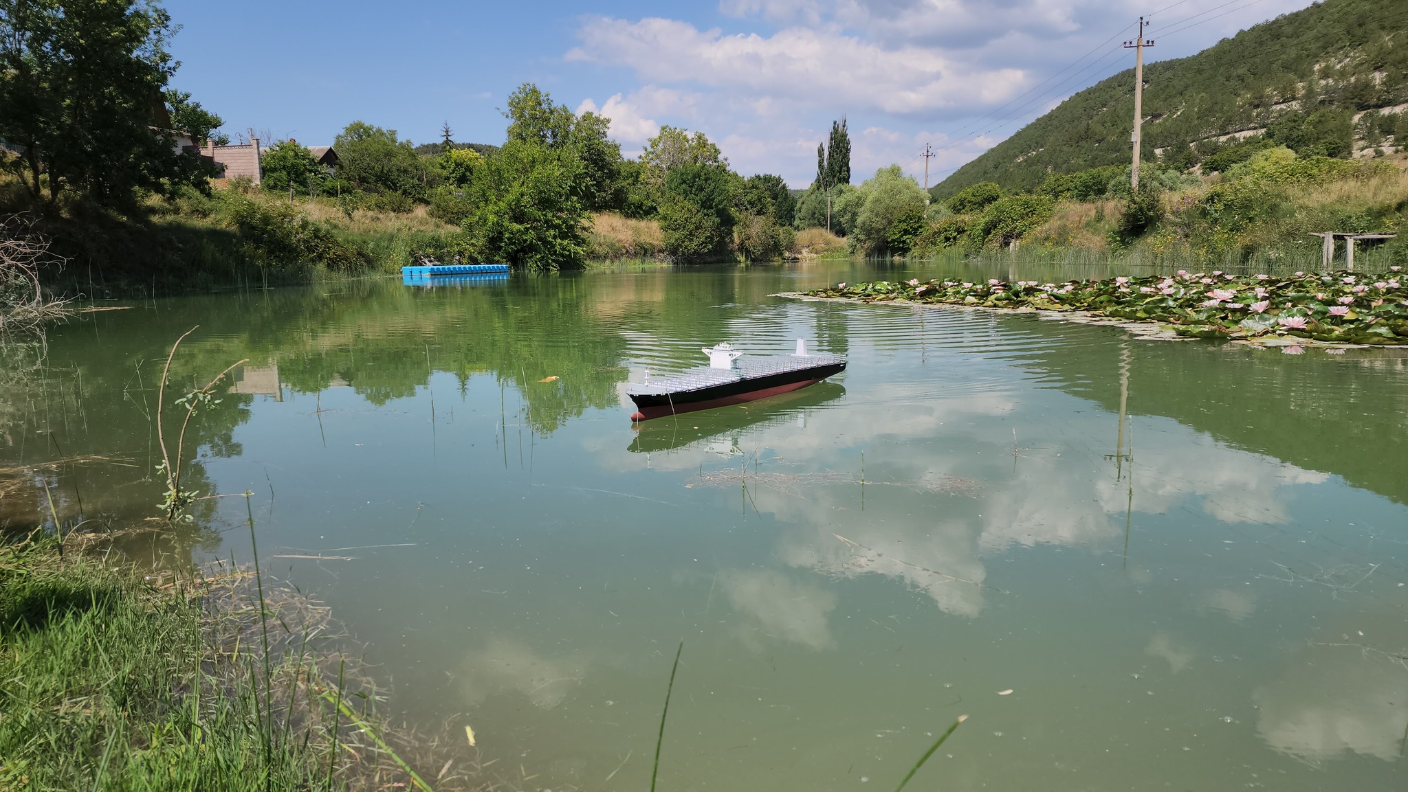Начал собирать еще в 2020 году. Один корпус остался в прошлой жизни, вывез только переднюю и заднюю надстройки в полу разобранном состоянии. В 22 году сварганил новый корпус из пенопласта, бумаги пропитанной эпоксидкой и огромным количеством шпатлевки для машин. Очень долго затирал, пришлось переделывать носовую и кормовую оконечности. В 23 году довел корпус до ума установил движитель и испытал на ближайшем озере без балласта. Модель очень сильно подвержена ветровому сносу, в принципе как и сам прототип.
