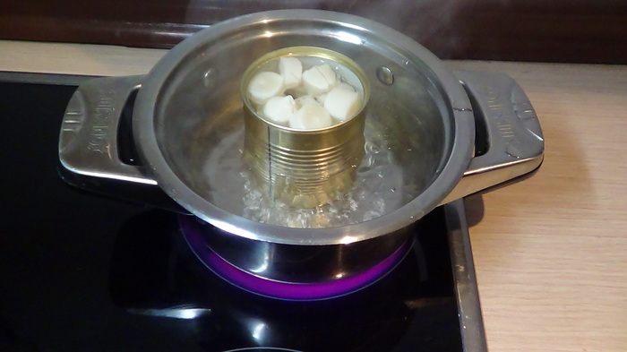 Берем кастрюльку с водой и ставим на плиту, когда вода начнет закипать, погружаем в неё нашу баночку с нарезанными свечами минут на 5, если воска мало, то добавляем по факту. Главное условие, чтобы наш шарик окунался полностью.