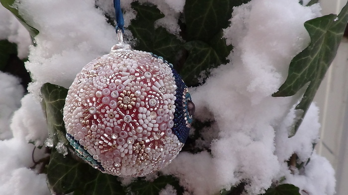 После нанесения схемы на шар начинаем выкладывать бисер при помощи иглы.