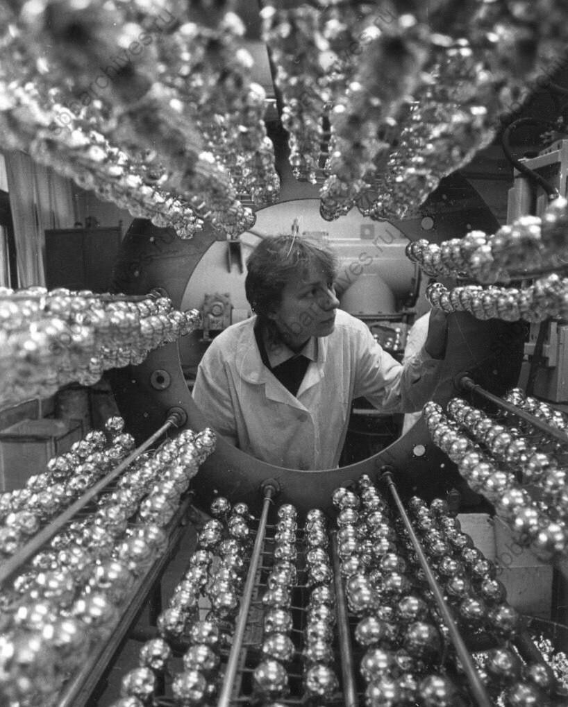 Мастер фабрики «Ёлочные украшения» Светлана проверяет качество ёлочных игрушек после покраски, 1986 год. 🎄