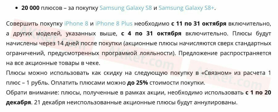 Вся суть акции заключается в том, что при покупке Galaxy S8 или S8+ покупателю на карту «Связной-Клуб», через 14 дней после покупки, будут начислены 20 000 бонусных баллов (рублей). Их можно потратить на покупку любых товаров в магазине «Связной» в период с 1 по 20 декабря включительно. Важно заметить, что оплатить бонусами можно до 25% от стоимости всех покупок. Если они использованы не будут, то они автоматически сгорят 21 декабря.