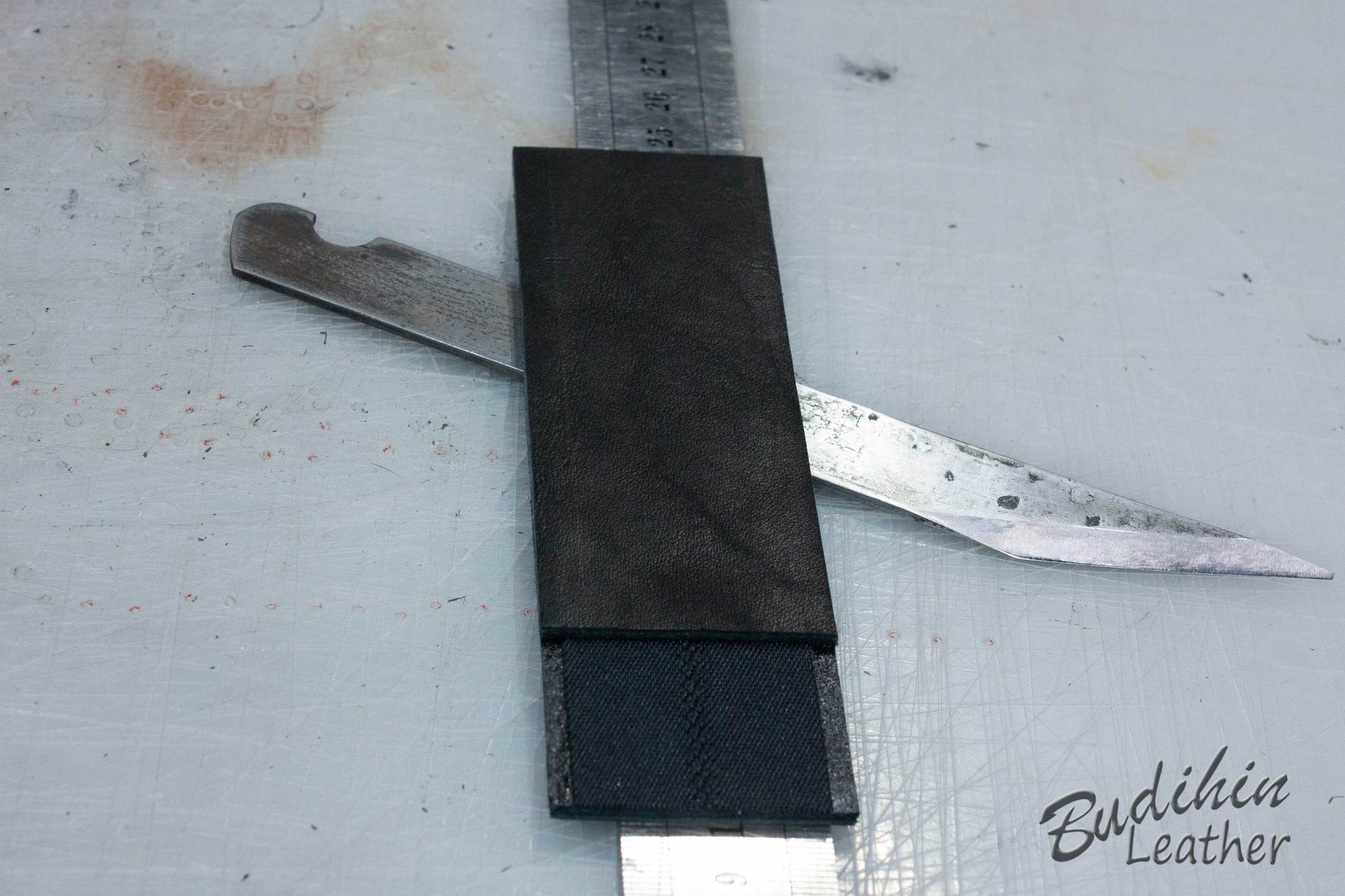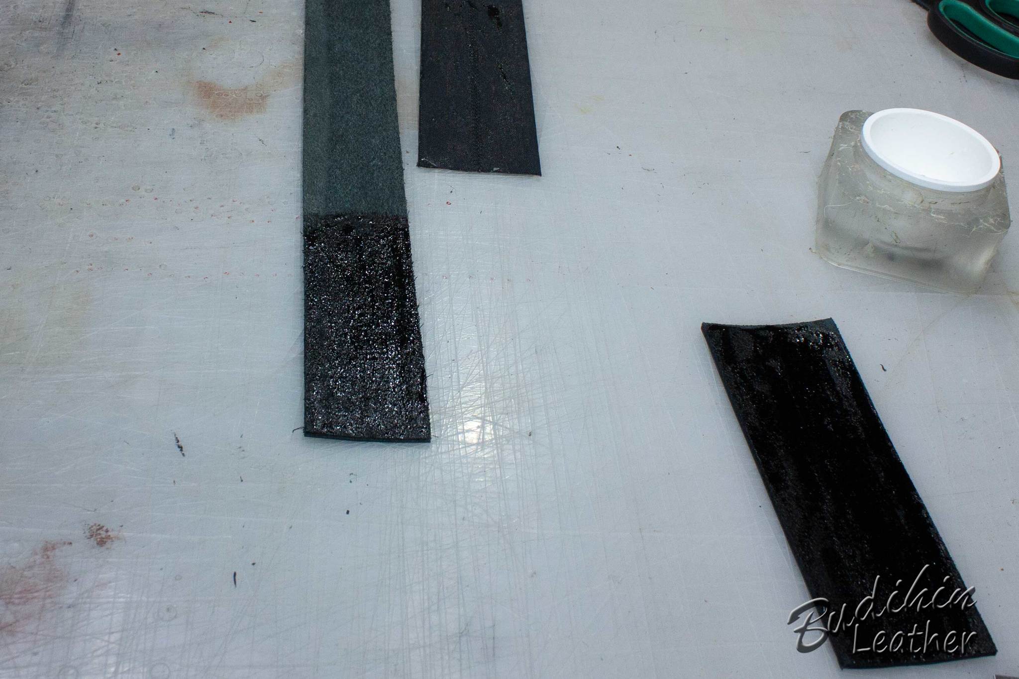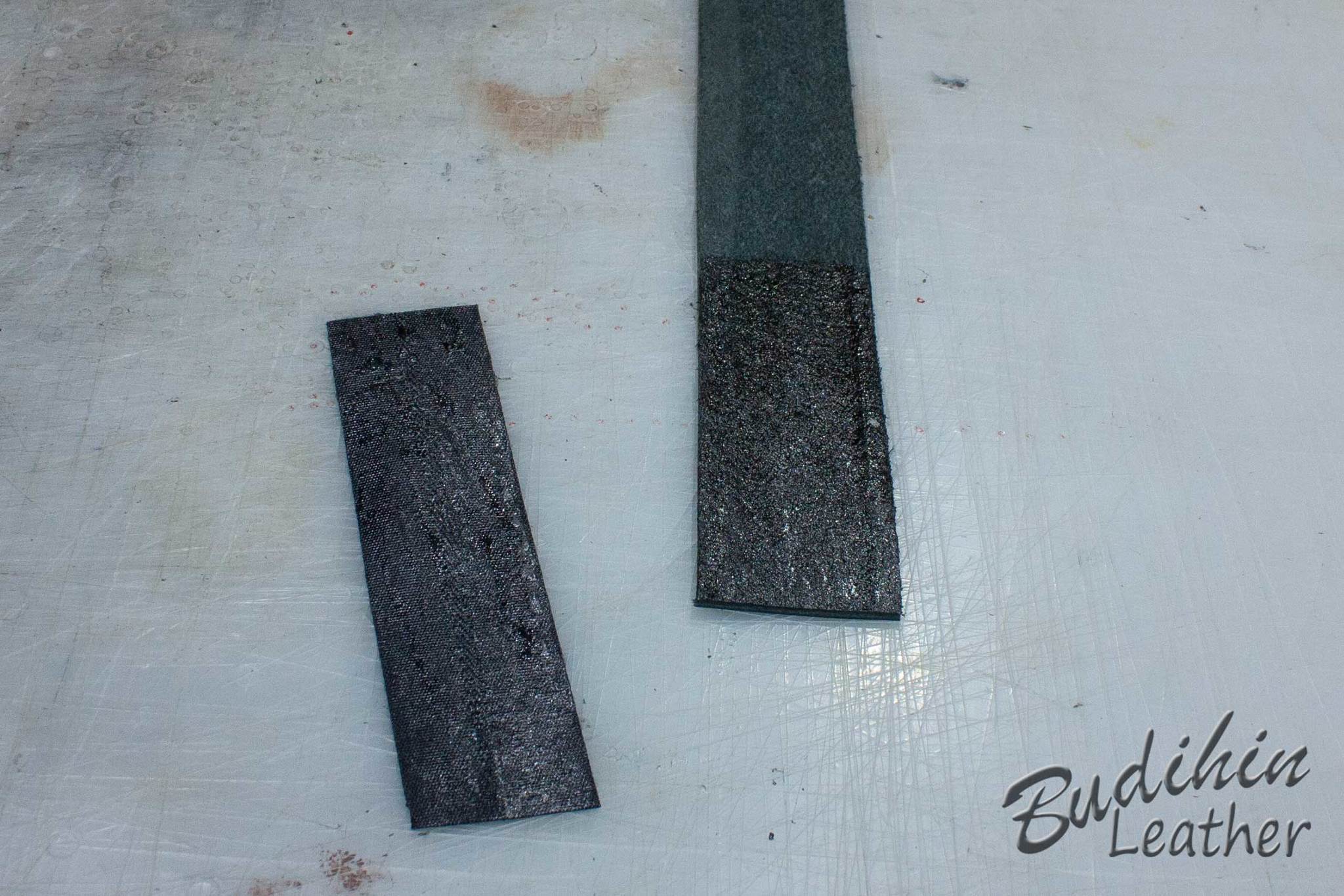 Слева на право, корсажная лента ширина 50 мм, кусок кожи на подклад, спущенный до 1.8 мм, по ширине как правило шире лицевого отреза на 10-15 мм. Лицевая кожа спущена до 2.5 мм что бы в итоге получился бутерброд 4.6 – 4.8 мм. Лицевая кожа сразу в нужной ширине, на фото ширина 40 мм.