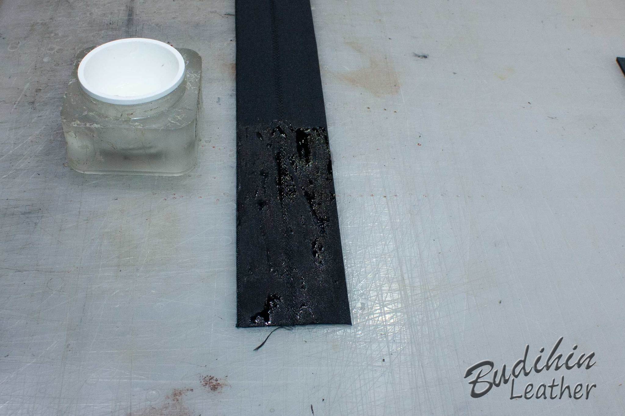 На корсажную ленту наношу клей и даю высохнуть минут 10 максимум. Использую однокомпонентный полиуретановый клей POLIGRIP M320. Он предназначен для приклеивания верха из кожи и синтетики с подошвами из ПУ, ПВХ, релака, кожи и резины. Для работы требует термоактивации. В целом может склеить и без термоактивации, но я стараюсь делать так как привык)