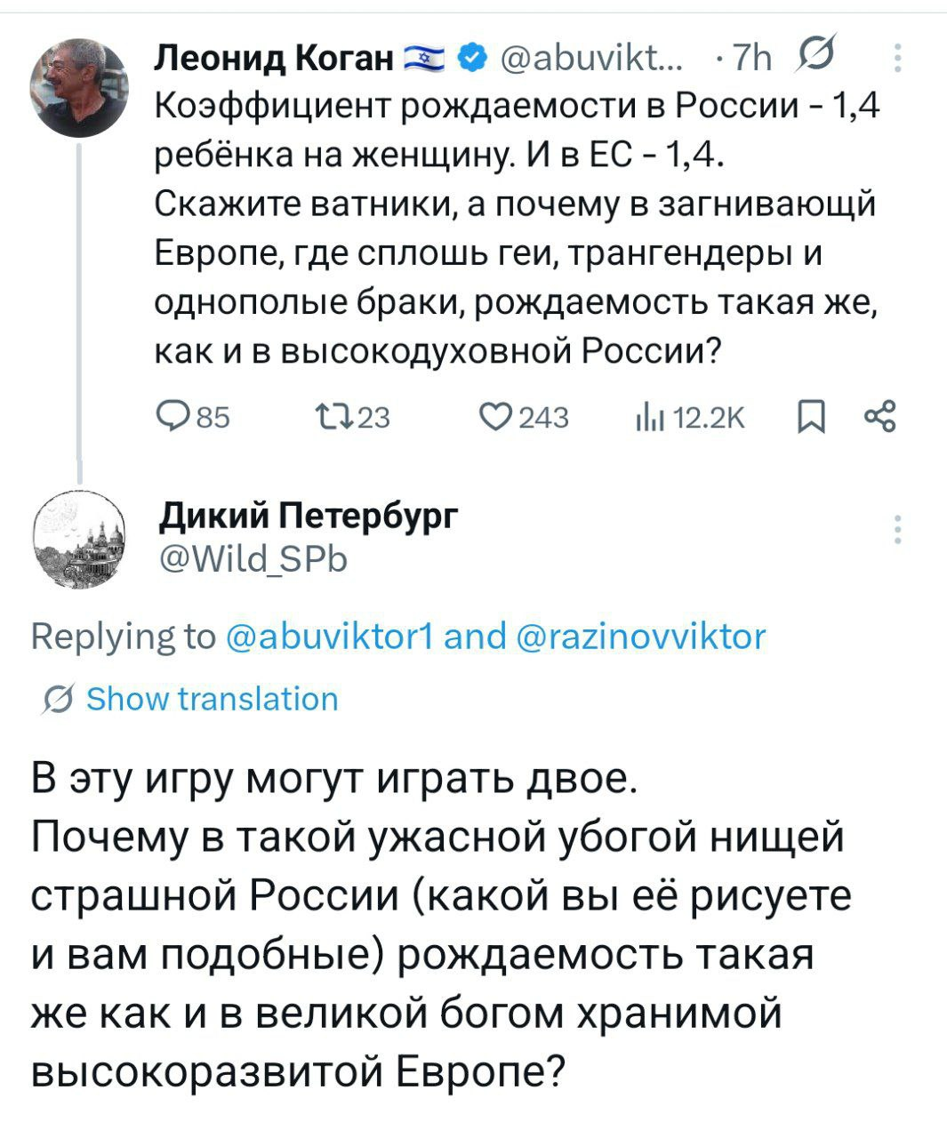 3912 TvoiIstorik Политика Мастерство манипуляции оно такое 6 часов назад (для модераторов, на втором твите у автора очевидно САРКАЗМ, и он не считает Россию такой) ИсточникИсточник Россия Критическое мышление Рождаемость Европа Скриншот Политика X (Twitter) Комментарии 356 296 180 56 9 4 3 3 2 1 Ещё 5