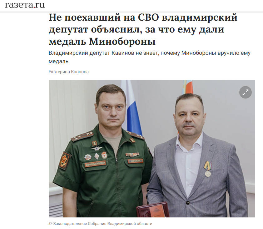 Депутат заксобрания Владимирской области Роман Кавинов, который обещал поехать в зону СВО, но не поехал, получил от Минобороны медаль «за вклад в укрепление обороны Российской Федерации». Сам чиновник заявил «Газете.Ru», что не знает, почему его наградили, но предположил, что это связано с его гуманитарной работой.