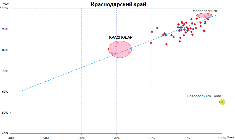 Этот график замечателен тремя вещами. Во-первых, если потрудиться посчитать среднюю явку и средние голоса в Краснодаре, то получится явка ровно 70%, а «За» ровно 80%. Это, я считаю, уже почерк не младшего научного, как в Заречном Пензенской области (там подгоняли только явку к 60%), а уже как минимум старшего научного сотрудника (подогнать к круглой цифре одновременно и явку и голоса «За» - нетривиальная задача на мой неопытный в этих делах взгляд). Во-вторых, удивительным образом на линии тренда Чуровой-Памфиловой место отдаленных сельских участков занял город Новороссийск со сказочными 96% «За». В-третьих, в этом же Новороссийске не менее удивительным образом прозевали целый ТИК с достоверными (55% «За», лежит на линии тренда «логичности»), а не выдуманными результатами голосования – я так понимаю это результаты голосования моряков судов дальнего плавания. Вообще, я думаю интересно будет выбрать со всей страны отдельно эти «честные» участки, чтобы посчитать реальные, а не памфиловские результаты голосования. Может в конце серии так и сделаю.
