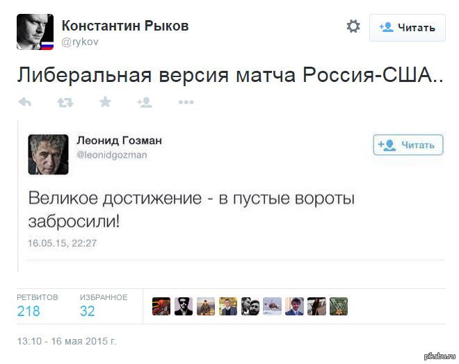 305 kostyanblch 10 лет назад Матч Россия : США. Либеральная версия. https://twitter.com/rykov/status/599668363825131520 Россия США Хоккей Либералы Политика X (Twitter)