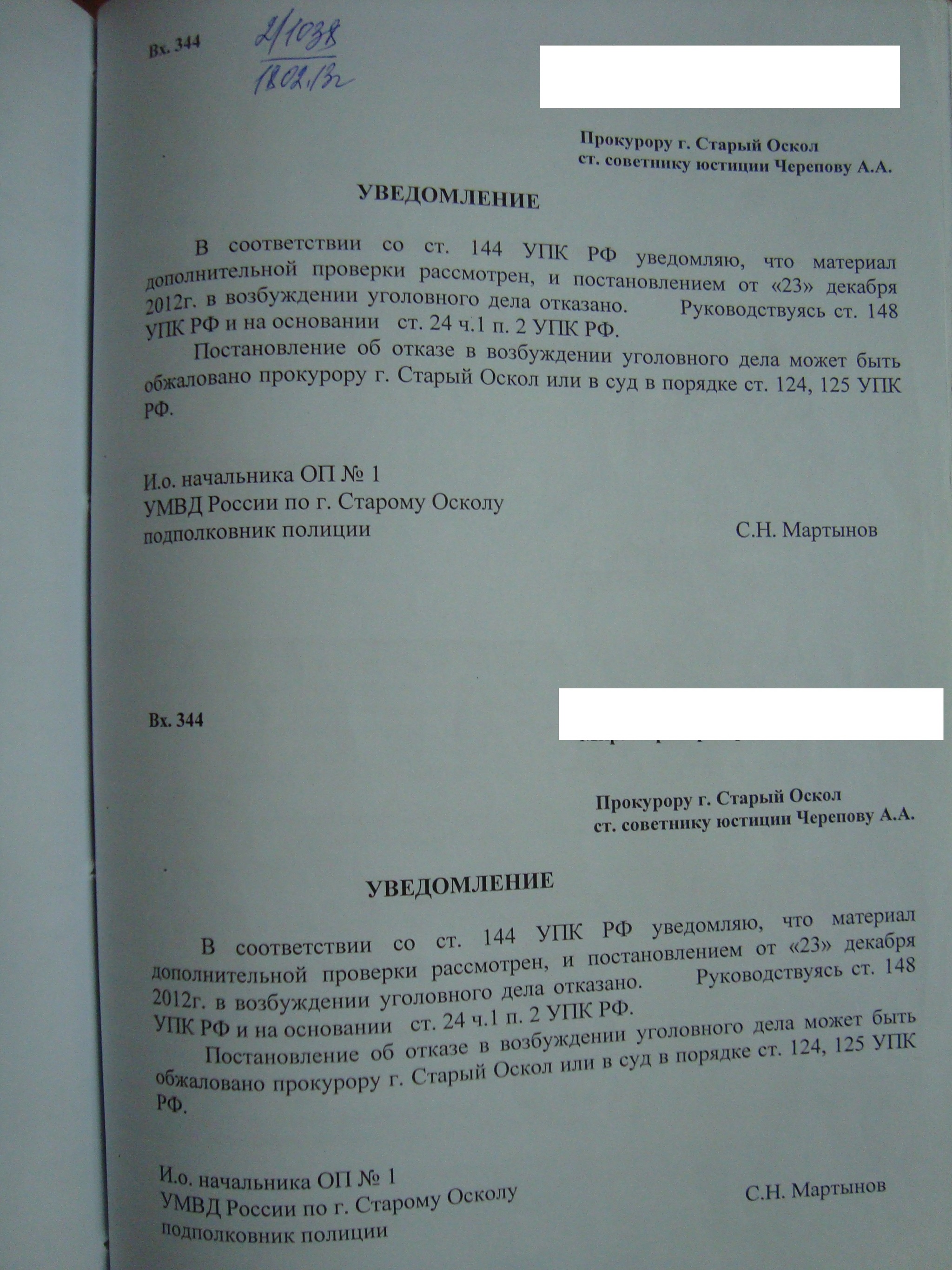 Уведомление об отправке постановления об отказе, само постановление отправлено не было. После первого постановления мне решили не выдавать постановления чтобы я не мог их обжаловать. Как оказалось и в прокуратуру не всегда передавали. Но об этом позже.
