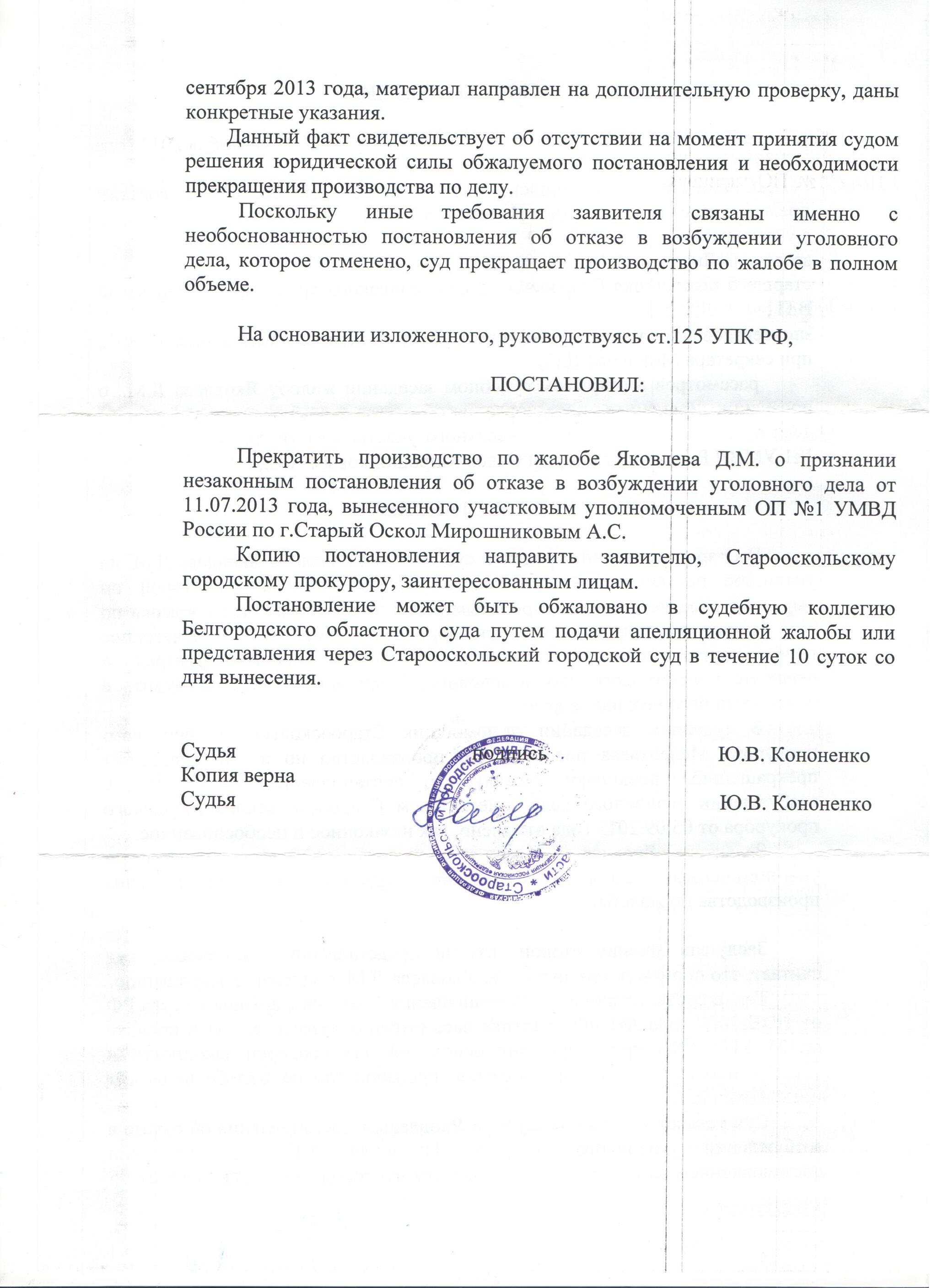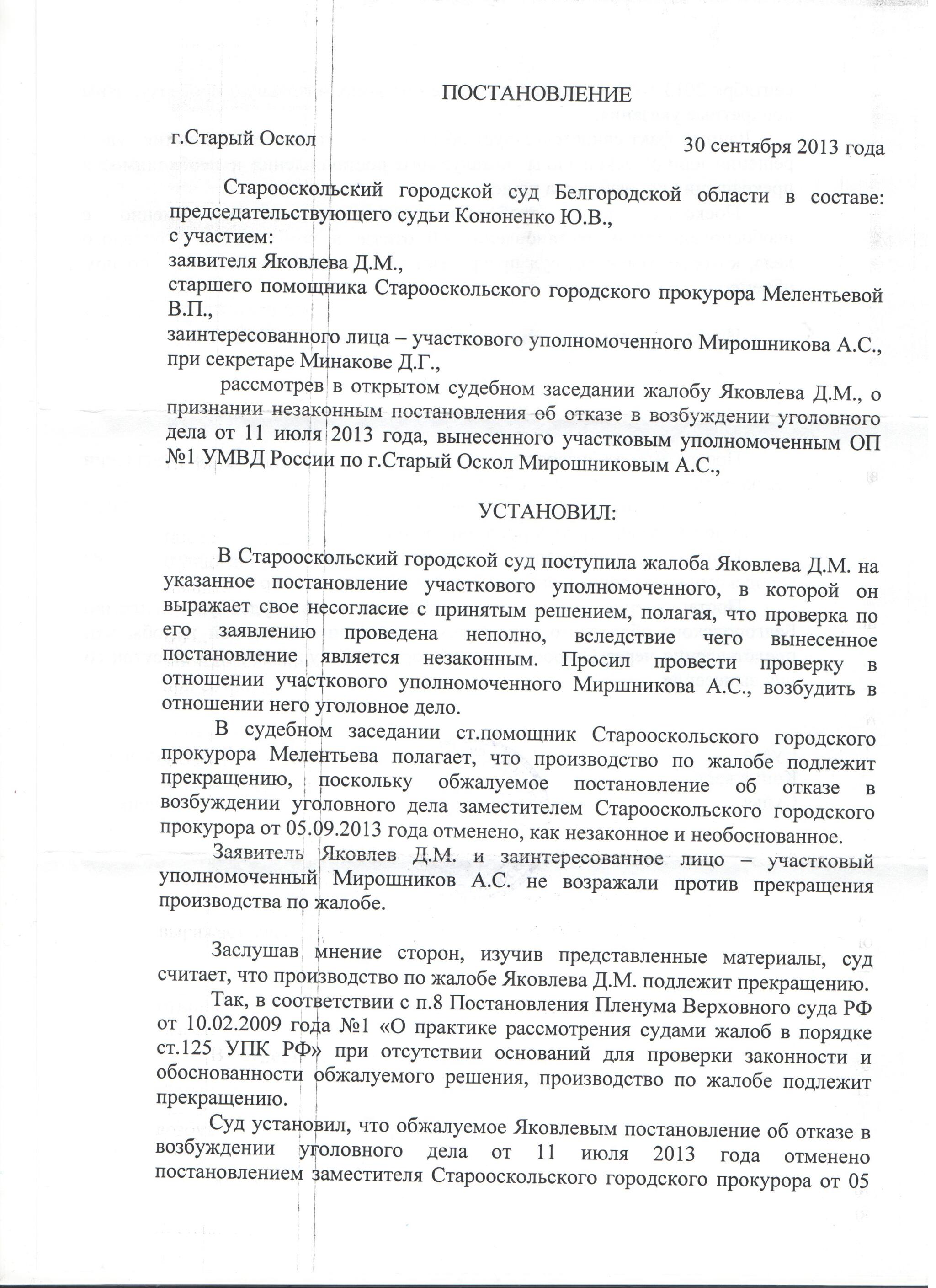 Постановление суда от 30.09.2013. Получив постановление мвд, я подал жалобу в суд. В суде помощник прокурора заявил, что постановление отменено. В очередной раз мои замечания не были рассмотрены и учтены.