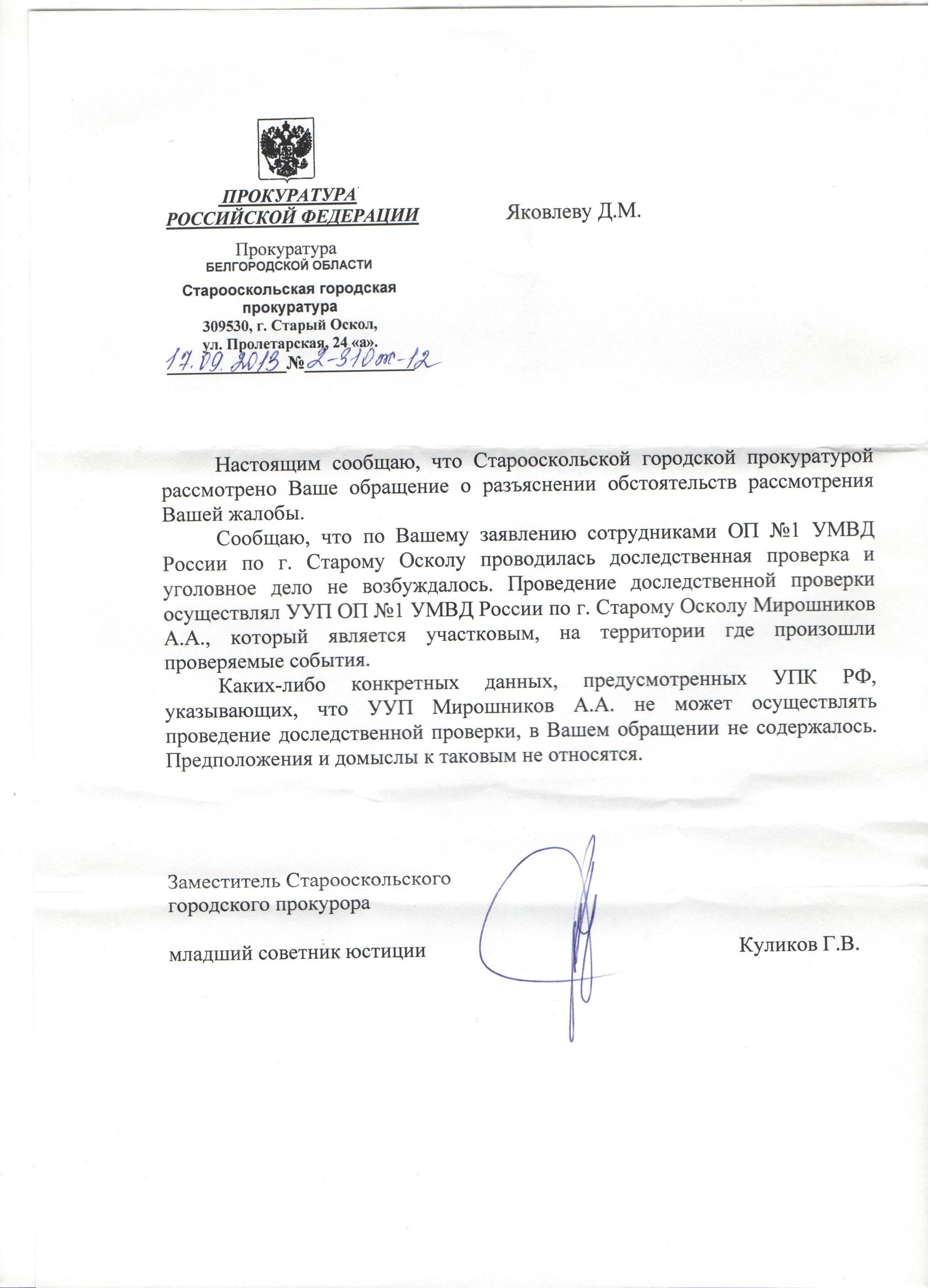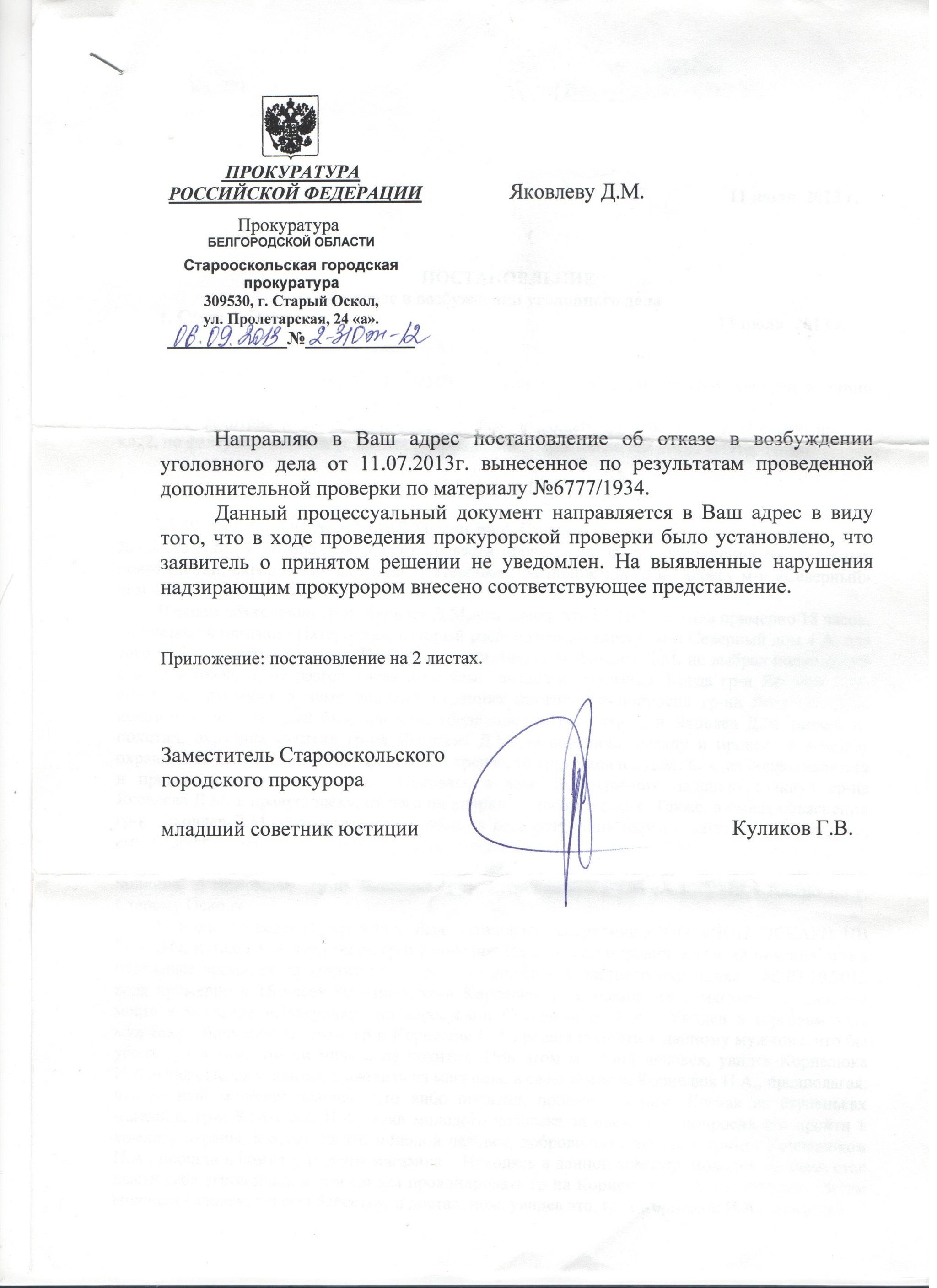Уведомление старооскольской прокуратуры от 06.09.2013. Я лично приходил на приём к черепову. Рассказал, что много раз обращался по поводу не получения постановлений об отказе и в этот раз прошло больше 2 месяцев с последней отмены постановления, а нового я ещё не получил. Прокурор вызвал помощника и потребовал ознакомить меня с постановлением, на что помощник сказал, что прокуратура тоже не получала постановление. По итогам беседы прокуратура обратилась в мвд, получила постановление и направила копию мне.