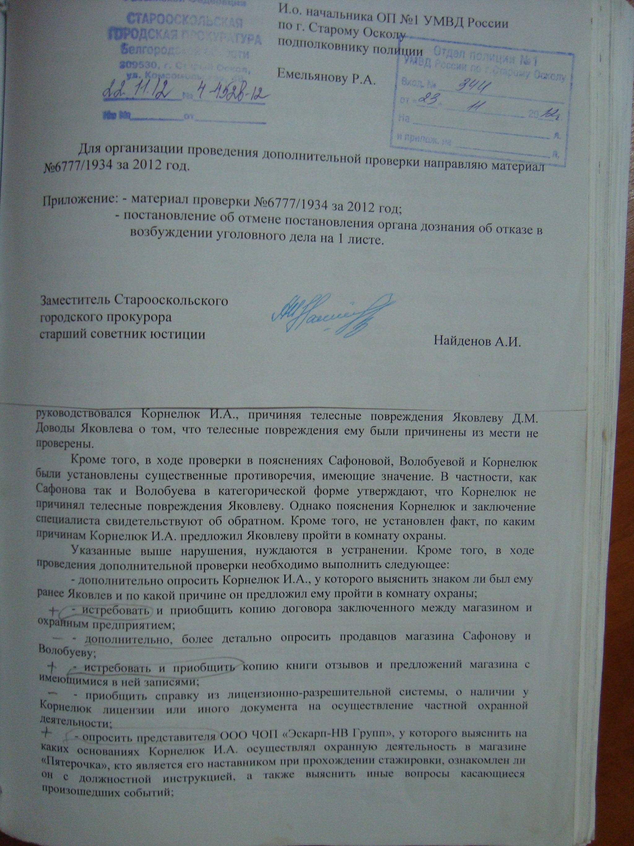 Указания прокурора были проигнорированы. Никого не опрашивали, книгу отзывов так и не истребовали, справку не истребовали, характеристику на корнелюка не собирали (только на меня), не были найдены очевидцы (в этом не было бы необходимости если бы была приобщена видеозапись), не были опрошены другие сотрудники магазина. Интересно, что прокуратура заметила нарушение привлечения к административной ответственности, но не заметила более важное нарушение. В постановлении участкового утверждается, что в соответствии со ст. 20 ч. 2 УПК РФ дела по ч. 1 ст. 115 УК РФ возбуждаются не иначе как по заявлению потерпевшего в мировой суд. На самом деле в ч. 2 ст. 20 УПК РФ написано, что возбуждаются по заявлению потерпевшего, но не указано, что заявление в суд. Согласно ч. 4 ст. 20 УПК РФ «руководитель следственного органа, следователь, а также с согласия прокурора дознаватель возбуждают уголовное дело о любом преступлении указанном в частях второй и третьей настоящей статьи…». Обращаю внимание, что я подал заявление в отношении неизвестного мне лица и его личность не была установлена. Поправьте если я не прав, согласно п. 3 ч. 1 ст. 145 УПК РФ орган дознания по уголовным делам частного обвинения передаёт в суд в соответствии с частью второй статьи 20 УПК РФ.