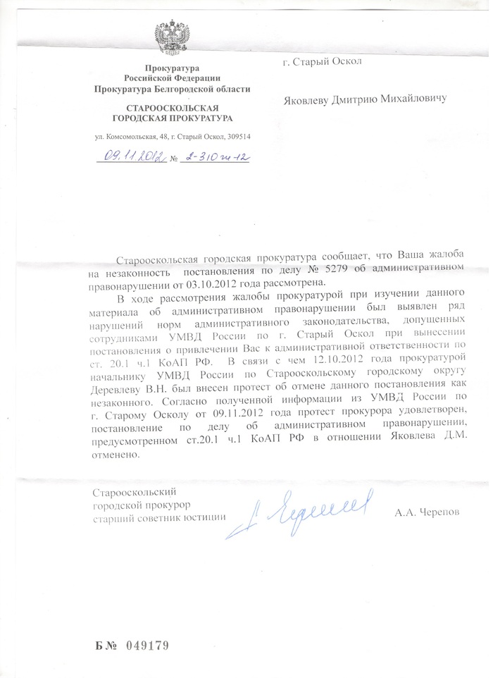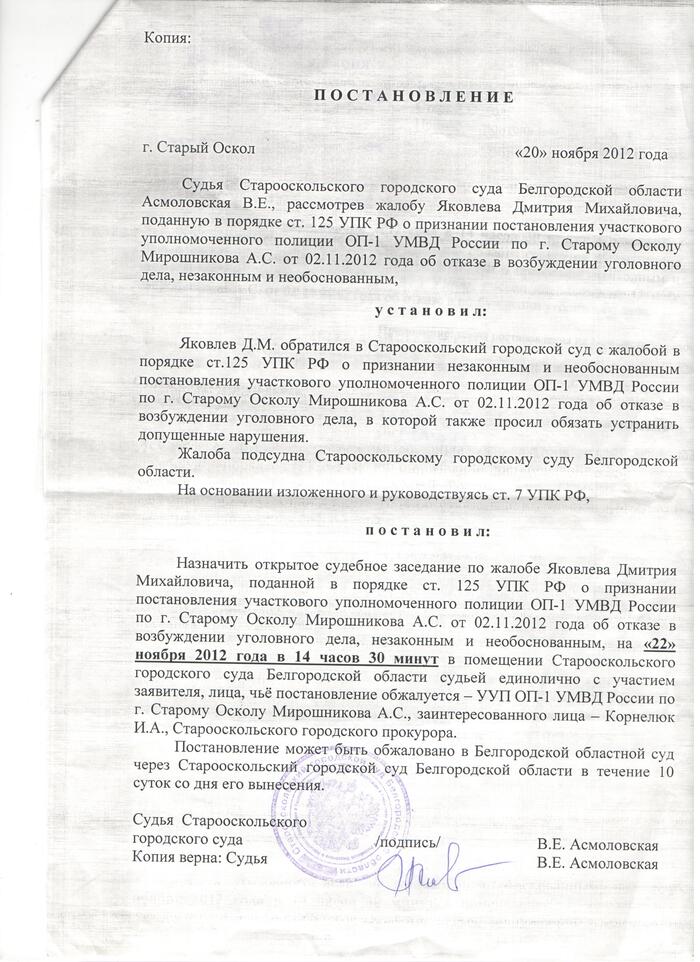 Поэтому дополнительно публикую постановление об отмене отдельно. Важно обратить внимание на даты. В ноябре я подал жалобу на постановление об отказе в возбуждении уголовного дела. 20.11.2012 было назначено судебное заседание на 22.11.2012. В день назначения судебного заседания 20.11.2012 прокуратура отменила постановление. Публикую само назначение и решение. Для первого раза это может показаться совпадением, но это не так. В последующих публикациях будет видно.