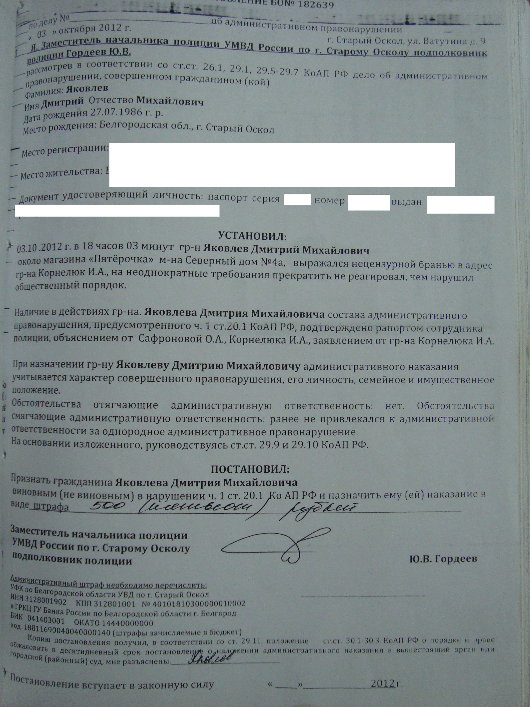 Из материала: Постановление о назначении мне штрафа. Уведомление об отмене постановления об отказе в возбуждении уголовного дела. Само постановление фотографировал не полностью, так как оно у меня уже было отдельно и лучше качества.