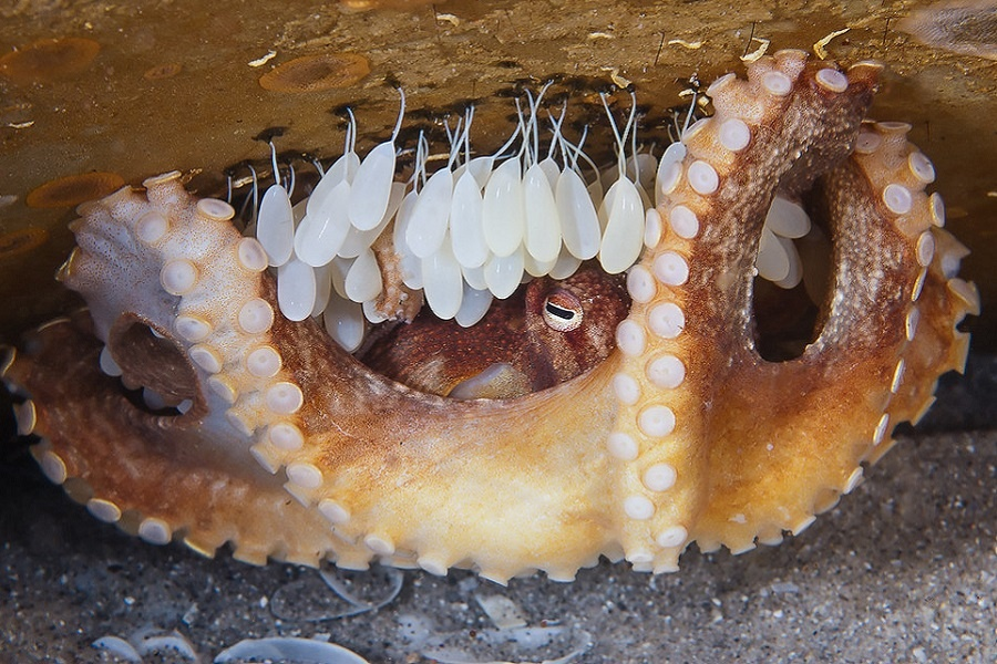 Самки осьминогов фанатично преданы своим материнским обязанностям в буквальном смысле до последнего вздоха. Осьминоги, имеющие в среднем довольно короткий срок жизни – обычно один-два года, откладывают за раз несколько тысяч яиц, за которыми ухаживает самка. В течение нескольких месяцев она активно охраняет кладку и заботится о ней.