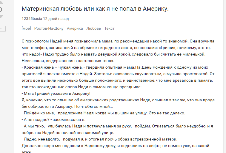 С психологом Надей меня познакомила мама, по рекомендации какой-то знакомой. Она вручила мне телефон, записанный на обрывке тетрадного листа, со словами: «Гришик, по-моему, это то, что надо!» Надю трудно было назвать девушкой яркой, следовало бы считать её миленькой. Невысокая, выдержанная в пастельных тонах.- Красивая жена – чужая жена, - твердила опытная мама.На День Рождения к одному из моих приятелей я поехал вместе с Надей. Застолье оказалось скучноватым, а музыка простоватой. От этого все выпили несколько больше положенного, и единственное, что мне врезалось в память, так это неожиданные слова Нади в самом конце праздника:- Мы с Гришей уезжаем в Америку! Я, конечно, что-то слышал об американских родственниках Нади, слышал я так же, что она вроде бы собирается в Америку. Но чтобы со мной...- Пойдём ко мне, - предложила Надя, когда мы вышли на улицу. Это не так далеко.- А не поздно? - засомневался я. - А мы тихо, - улыбнулась Надя и потянула меня за руку, - пойдём.Отказаться было неудобно, и я побрел за Надей по ночной незнакомой улице. - Ладно, ненадолго, - подумал я, и отогнал прочь образ встревоженной матери. Довольно скоро мы подошли к Надиному дому, и поднялись на лифте, не помню уже, на какой этаж.- Проходи, только тихо, - впустила меня в квартиру Надя и заперла дверь.Она взяла меня за руку и повела в свою комнату. Сквозь задёрнутые занавески просматривались силуэты деревьев, слабо освещённые уличными фонарями. - Садись на диван,- предложила Надя и взгромоздилась мне на колени. Разговаривали мы мало, долго целовались и изредка прислушивались к звукам за дверями.- А с чего это ты вдруг про Америку заговорила? - спросил я Надю, - кажется, мы этого даже не обсуждали.- А ты что, против? – шепотом спросила она, стягивая с себя кофточку.- Может и не против, но как-то неожиданно, - заметил я, пытаясь расстегнуть Надин лифчик.- Погоди, я сама, - произнесла Надя и привычным движением нажала там, где надо.- Ты, правда, этого хочешь, - заглянула мне в глаза Надя, удерживая расстёгнутый лифчик на груди.- Ты про лифчик или про Америку?Ответить она не успела, так как в комнате спящих родителей неожиданно раздался телефонный звонок. Затем всё вроде бы стихло. И вдруг, прямо из-за дверей негромкий женский голос:- Надя, Надя, ты, что не одна? Тут женщина какого-то Гришу спрашивает.- Кто это? – испугалась Надя и автоматически застегнула лифчик.Сказать, что не знаю, было бы глупо. - Это, наверное, моя мама, - шёпотом признался я.- Кто? Мама? – вытаращила на меня глаза Надя, - а что ей надо?- Надя, так что сказать женщине, она ведь ждёт, - вновь раздался голос за дверью.- Скажи, что он здесь, - смутилась Надя и пристально посмотрела на меня.- Гриша, что за дела? Тебе тридцать лет. Причём тут мама?Мне нечего было ответить, и я промолчал.- Надя, женщина говорит, что уже поздно и чтобы я немедленно отправила его домой. Он что, несовершеннолетний?- Мама, скажи, что он уже ушёл, и иди спать, я сейчас выйду, - сказала Надя и застегнула кофточку.Бессмысленно говорить, что в Америку Надя улетела одна. Чему моя мама была несказанно рада.- Вот ещё, Америка, - смеялась она. Ты русский, а значит место твоё в России.