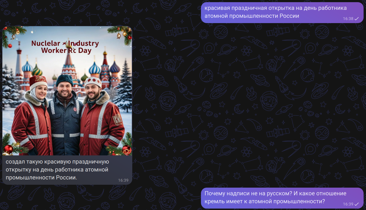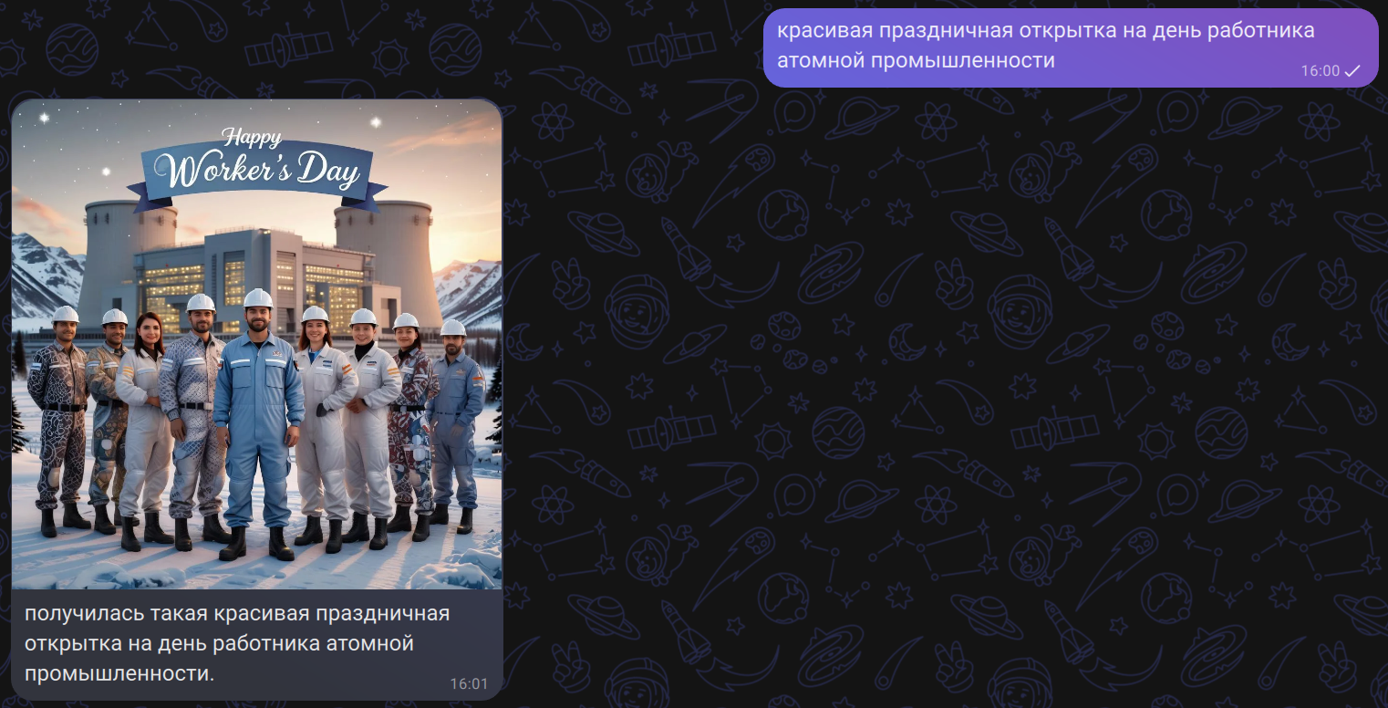 Поставил себе Max. И решил сгенерить GigaChatом открытку на День Атомщика (сегодня как раз), коллегам разослать.