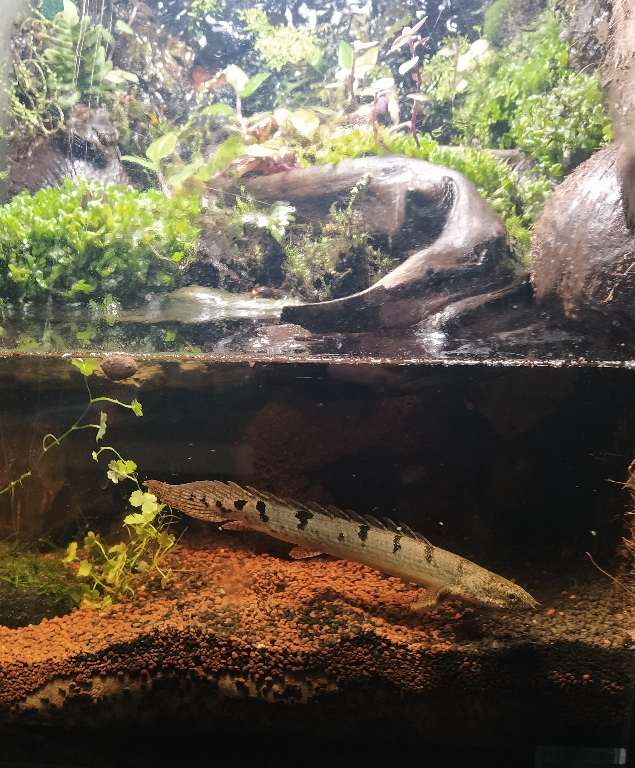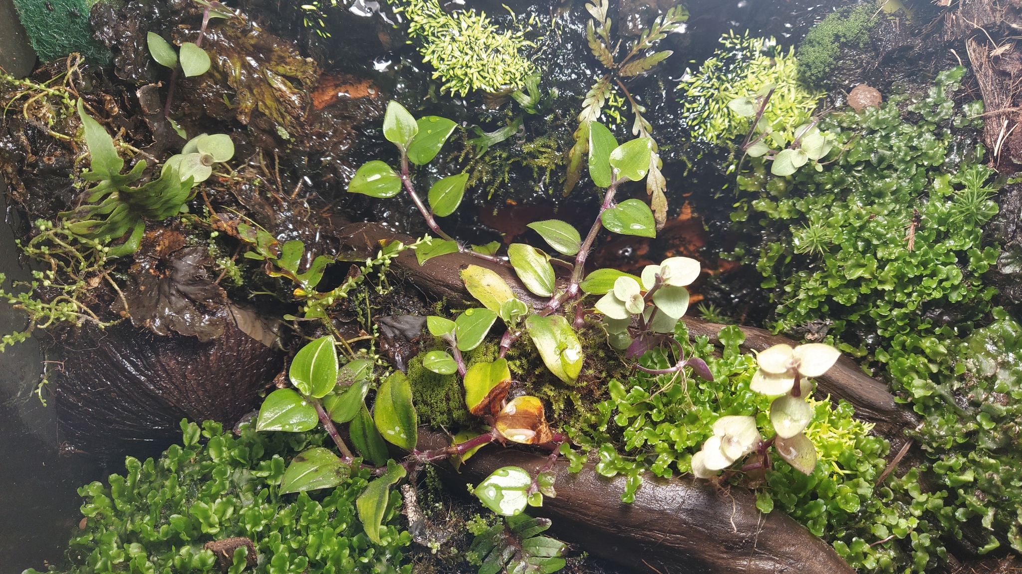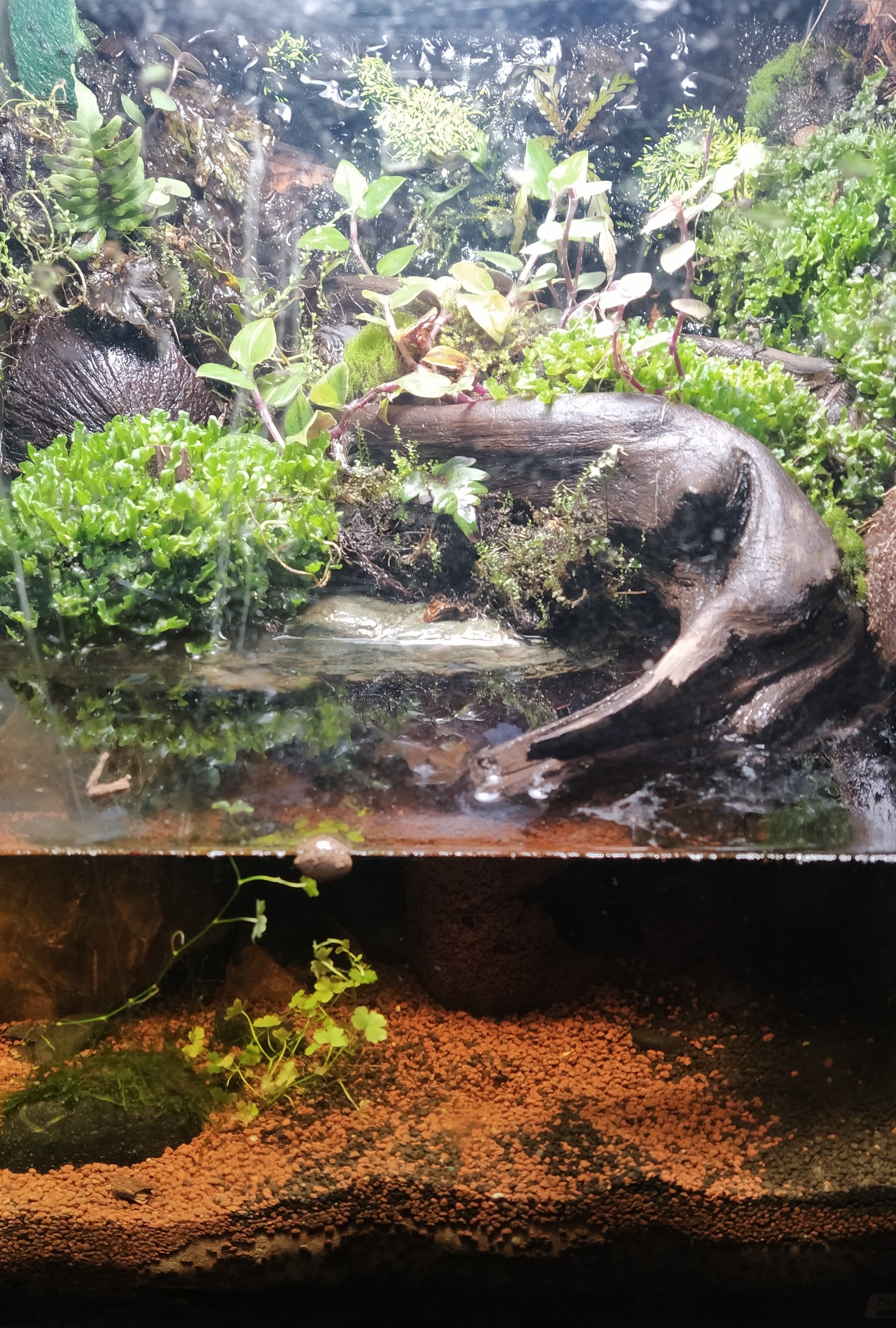Майне кляйне попытка сочетать низшие растения Ленобласти с тропическими высшими собратьями и тропическими же условиями. Печеночный мох уже как 3 месяца чувствует себя зелено=хорошо, вообще мхи пока не демонстрируют желание подохнуть. Папоротник (Asplenium sp.) отмирает полистно, увы. Аквариумная меристемная атрикулярия на стенках зеленеет, посмотрим, что дальше будет. Ах, да, полиптерус дельгези ждёт подходящего клиента, чтоб переехать к нему.