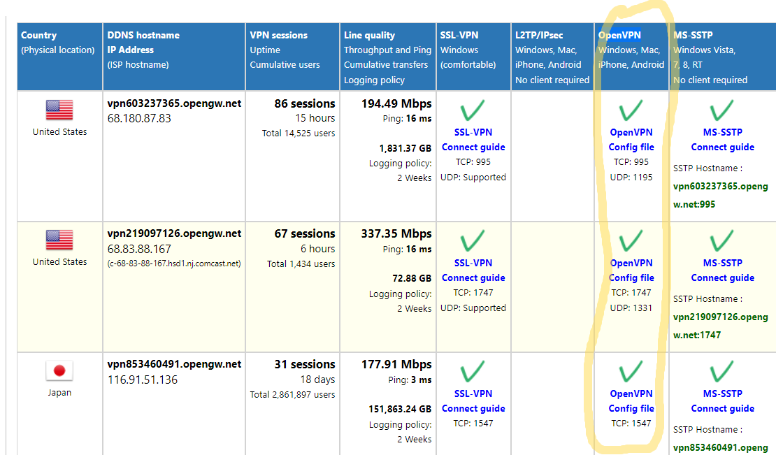 Первым делом идем на любой сайт, где есть открытые VPN сервера. Для небольших майнеров я бы посоветовал сервера на сайте https://www.vpngate.net/en/ (не реклама, сайт довольно популярный). Если кто серьезно переживает, что большой брат следит, то выбирайте платные сервера OpenVPN - яндексим усиленно!