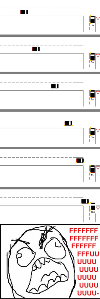 да я понял понял. Просто говорю, что таких мудаков тупых полным полно. А рассказал свою ситуацию потому что она у нас повторяется очень уж часто. Намного чаще чем включенный правый поворотник и проезд прямо
