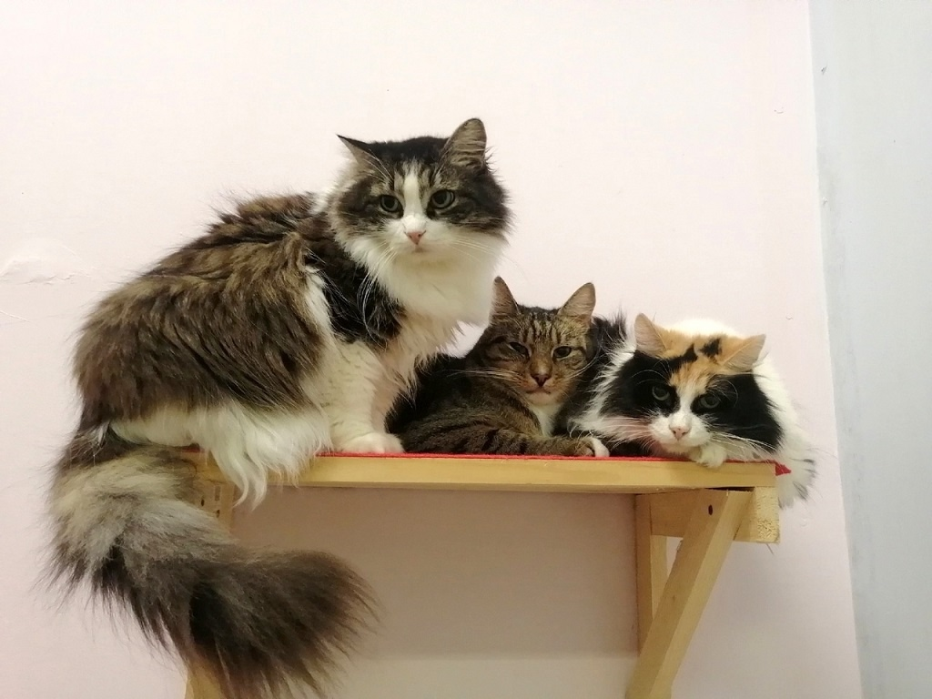На фото живописная группа - мама и два ее великовозрастных ребенка. Мама - Майя (трехцветная), возраст 10 лет, уже 4 года живет в приюте.
