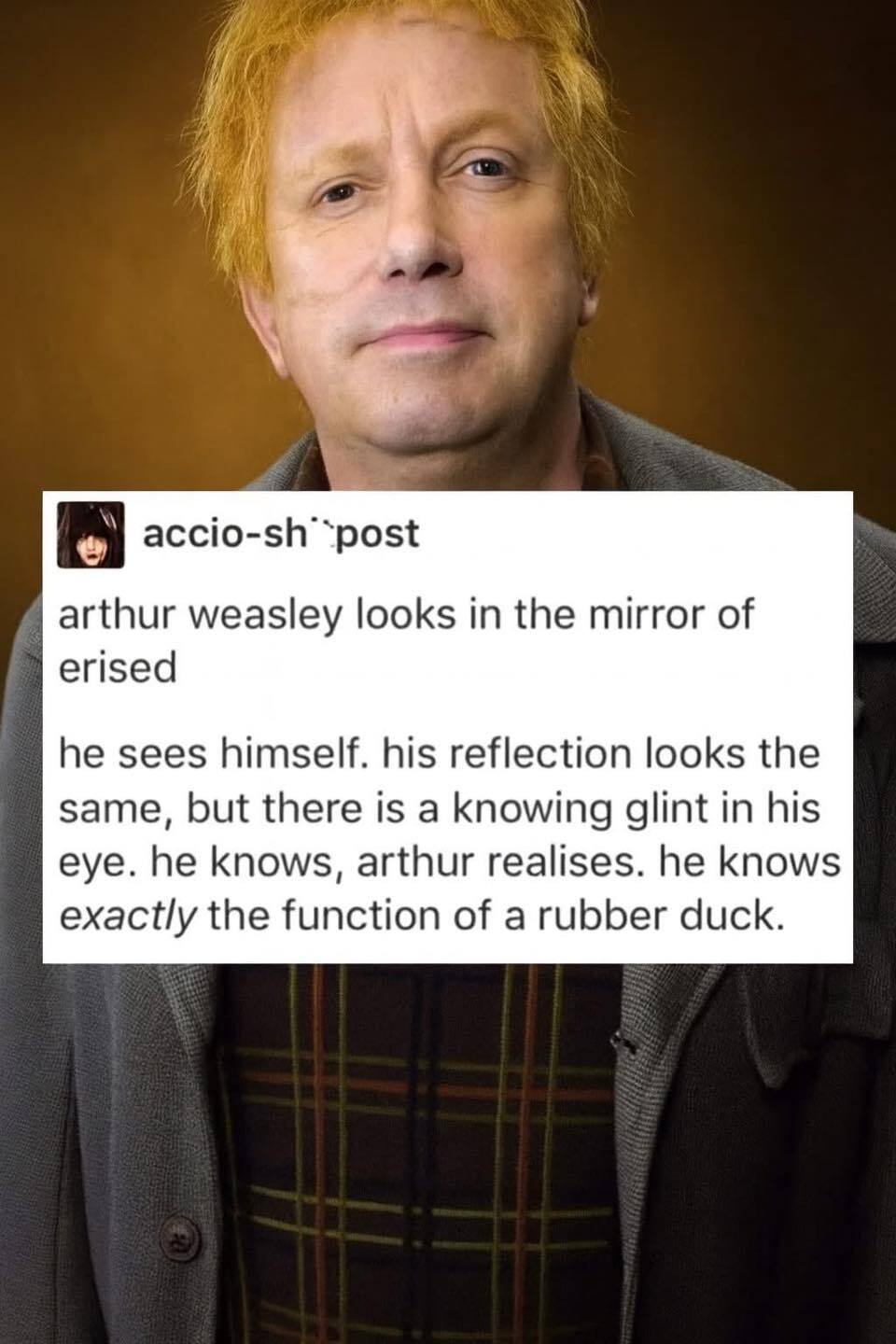 14 Nxtprl Лига Поттероманов Мечта сбывается 11 часов назад Артур Уизли смотрит в зеркало Еиналеж. Он видит себя. Выглядит как обычно, но с явным проблеском постижения во взгляде. Он знает, -- понимает Артур. Он точно знает, для чего нужна резиновая уточка. Артур Уизли Юмор Маглы 7 3 Ещё 0