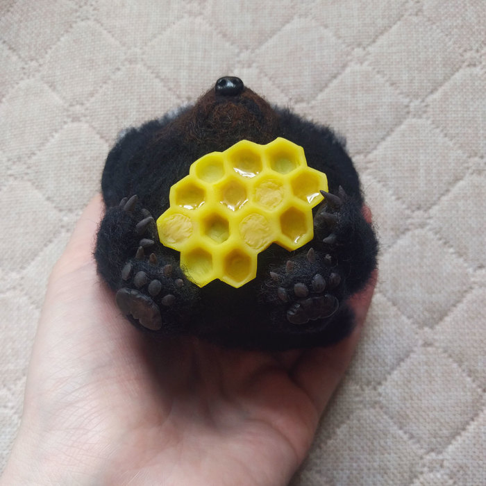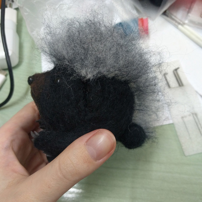 Ну, тут точно ирокез ) И хвостик появился. Обратной иглой по всей поверхности шерсть вытаскивается наружу, а потом долгая процедура стрижки, причесывания и приведения медоеда в порядок. Все вокруг было в мелкой шерсти, поэтому было не до фотографирования.