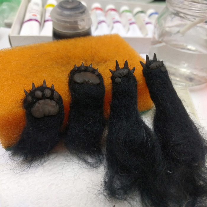 Лапки! Лепим из полимерки и запекаем много маленьких штучек, а потом аккуратно все это вклеиваем и приклеиваем, стараясь не испачкать шерсть и не приклеиться к ней намертво.